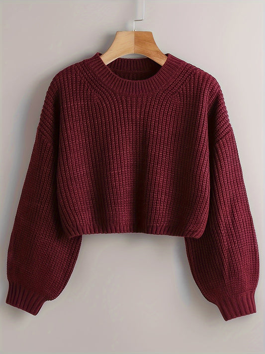 Sixsr Solid Crew Neck Crop Sweater, Casual Lantern Sleeve Comfy Pullover Sweater, Women's Clothing