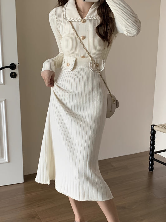 Sixsr Ribbed Solid Midi Dress, Elegant Long Sleeve Bodycon Sweater Dress, Women's Clothing