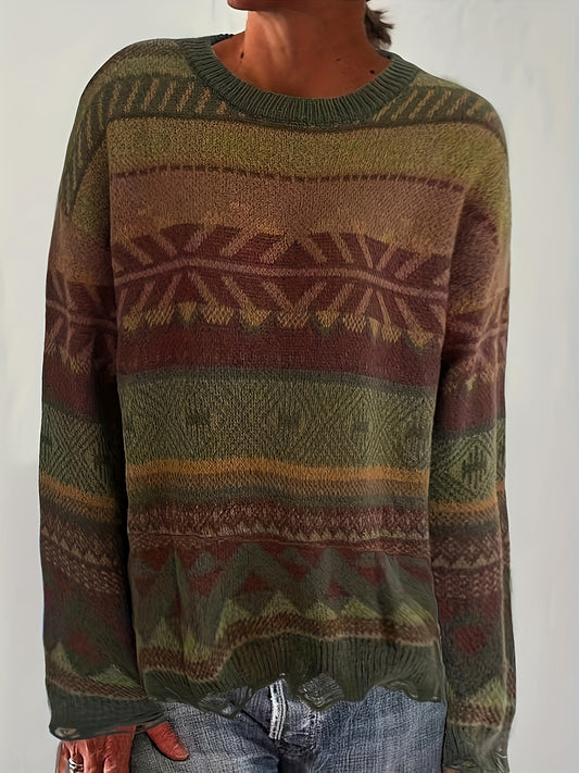 Sixsr Graphic Print Ripped Knit Sweater, Vintage Crew Neck Long Sleeve Sweater, Women's Clothing