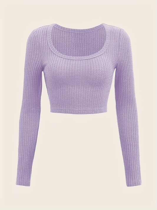 Sixsr Y2K Rib-knit Scoop Neck Crop Tee, Elegant Solid Sports Yoga Fashion Top For Spring & Summer, Women's Clothing