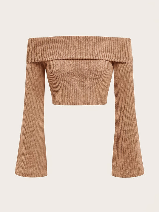 Sixsr Foldover Off-shoulder Cropped T-Shirt, Solid Color Long Sleeve Top, Women's Clothing