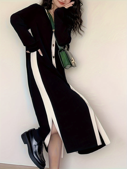 Sixsr Color Block Button Front Dress, Casual Long Sleeve Split Hem Dress, Women's Clothing