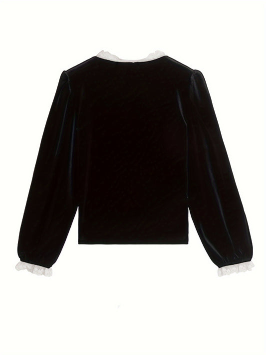 Sixsr Lace Stitching V-neck Velvet Blouse, Vintage Long Sleeve Button Front Blouse For Spring & Fall, Women's Clothing