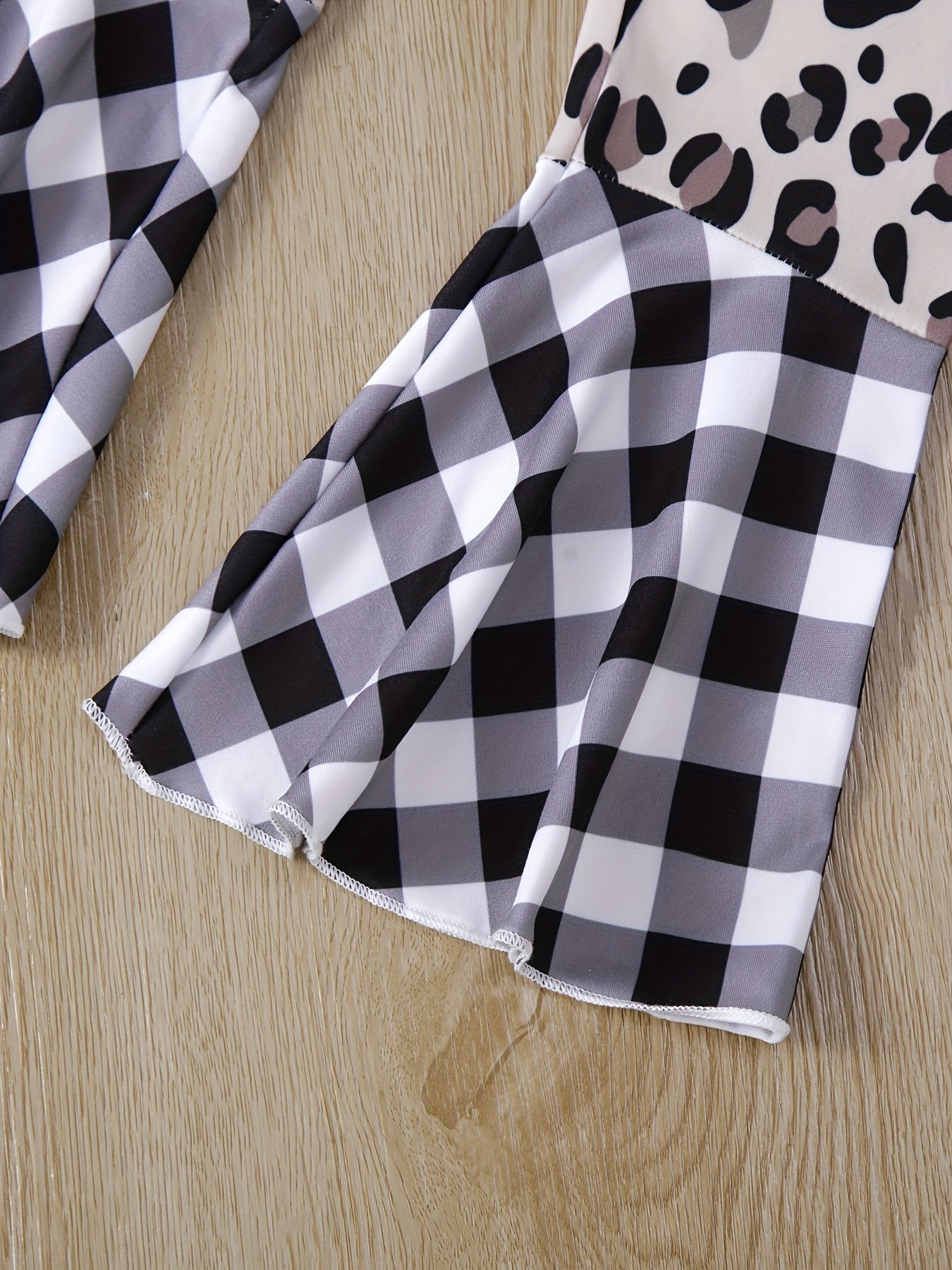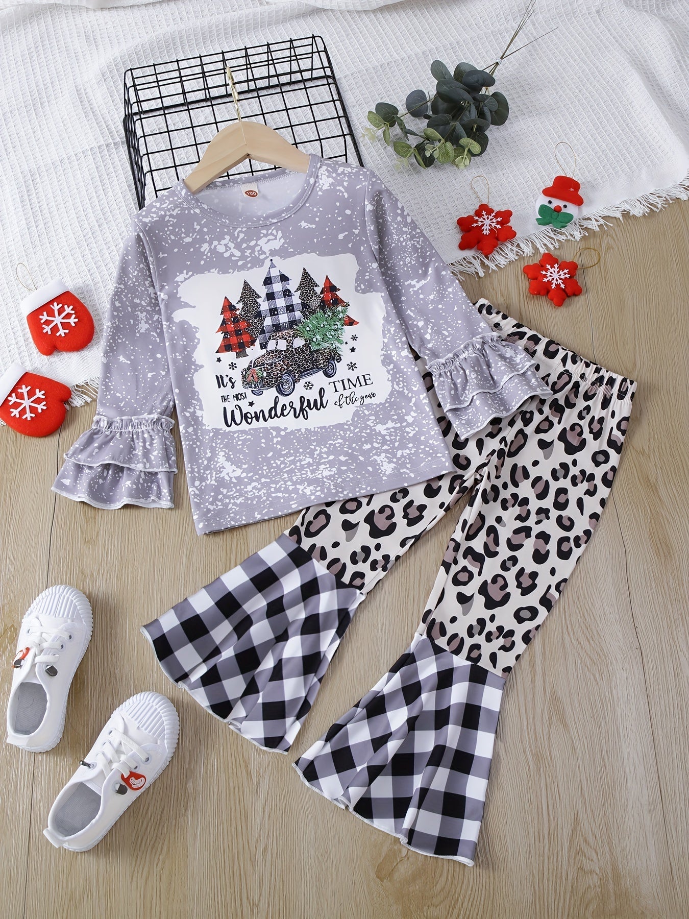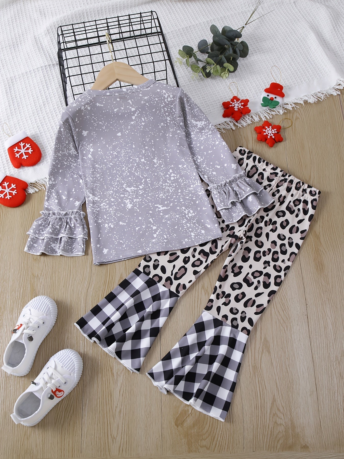 2pcs Girl's Christmas Style Outfit, Trumpet Sleeve Top & Leopard Plaid Pattern Flared Pants Set, Toddler Kid's Clothes For Spring Fall outdoors