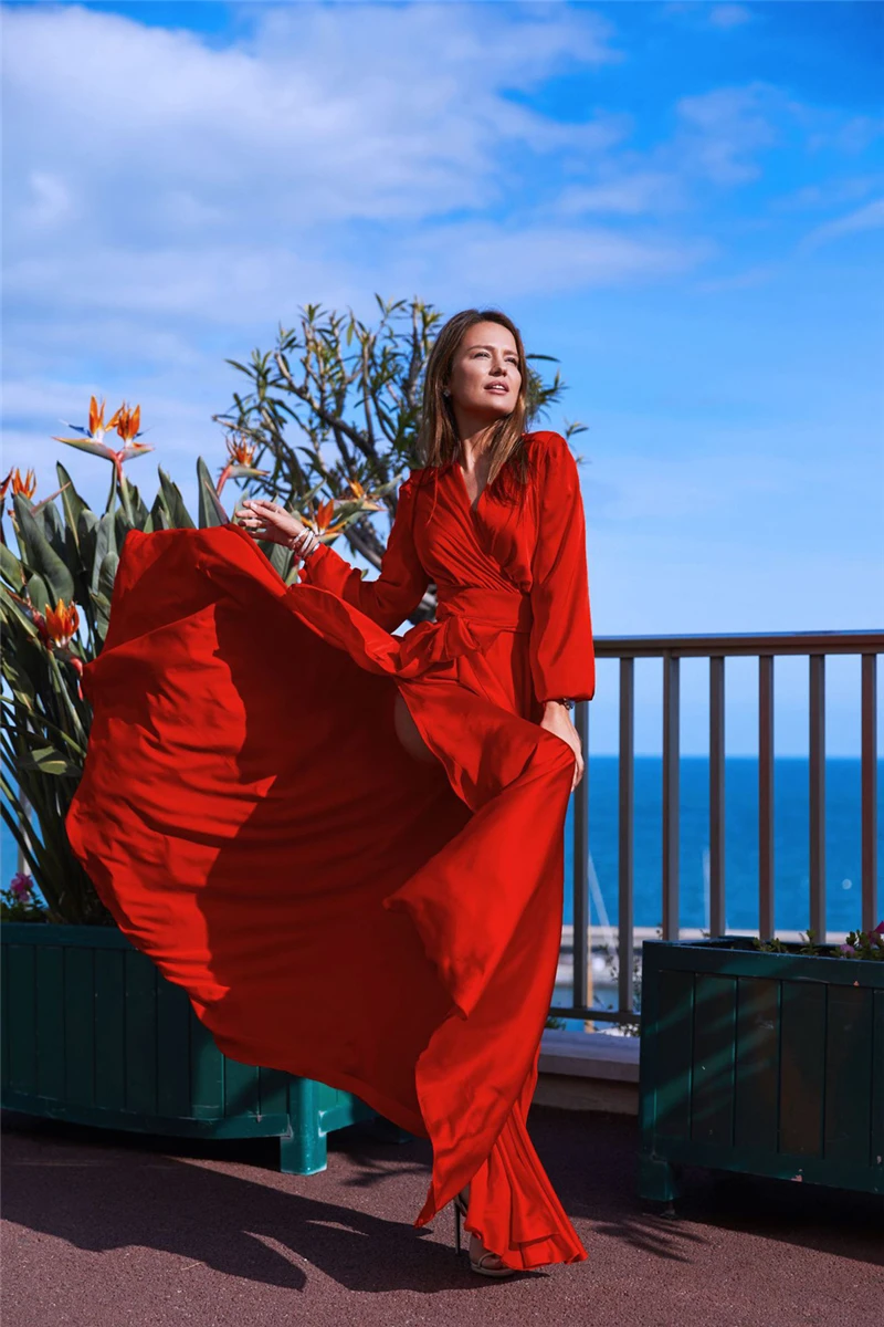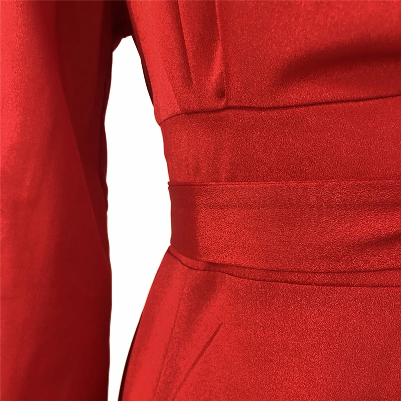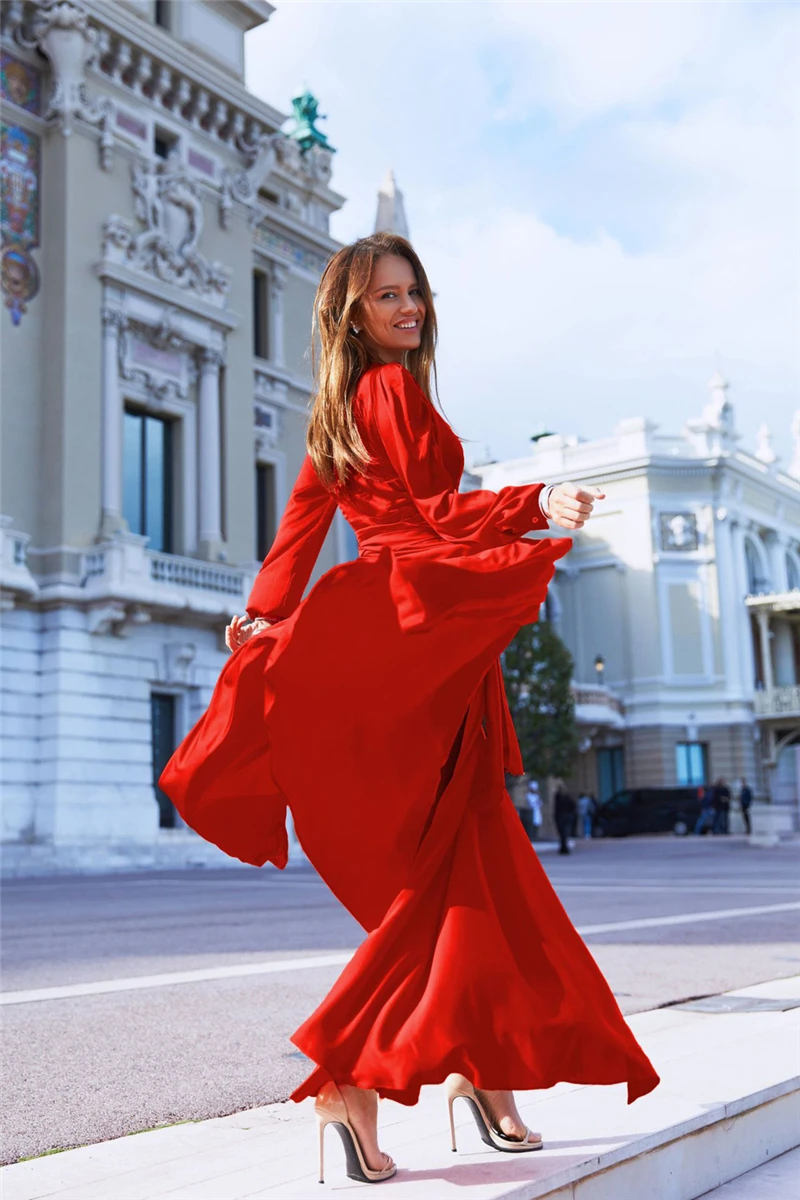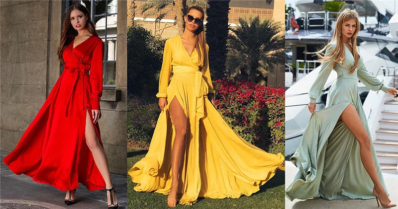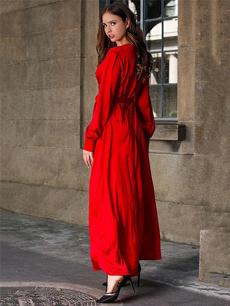 Sixsr Gifts For Women Autumn women's Long Sleeve Casual Style Polyester Material New V-neck Middle Waist Zipper Stitched Slit Large Swing Dress