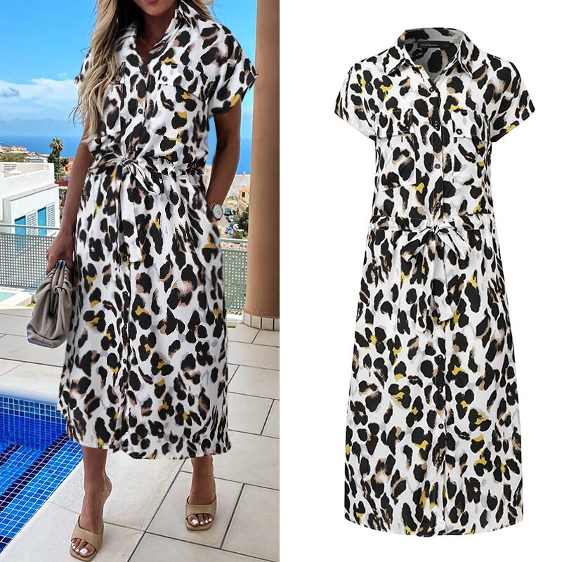 Sixsr Summer Sundress Women Elegant Dress Plus Size Short Sleeve Casual Loose Buttons High Waist Work Midi Vestidos Robe