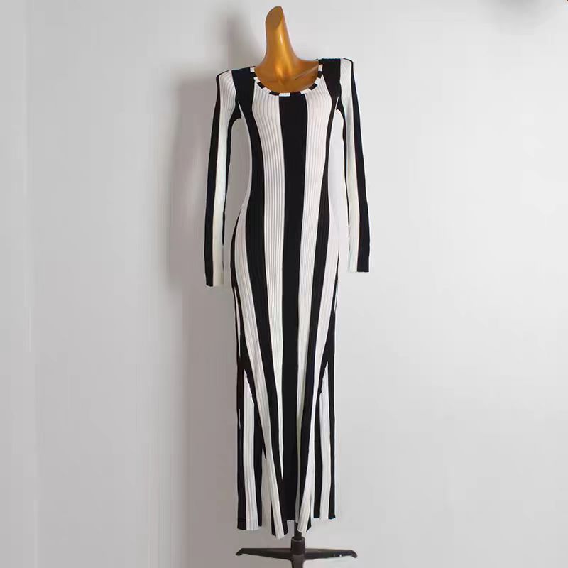 Contrast Trim Crew Neck Dress, Elegant Long Sleeve Bodycon Knitted Dress For Spring & Fall, Women's Clothing