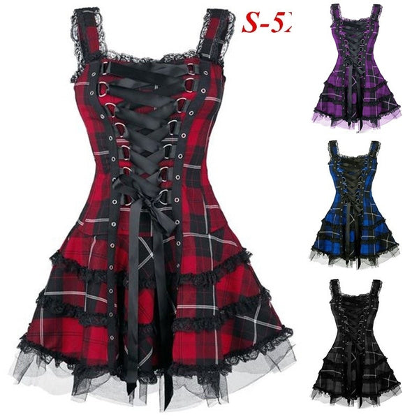 Sixsr Dress Women Classic Frill Lace Dresses Sleeveless Plaid Vintage Gothic Mini Dresses Ball Gowns Cosplay Costume Plus Size Dress