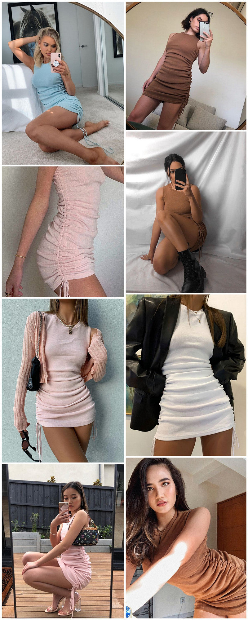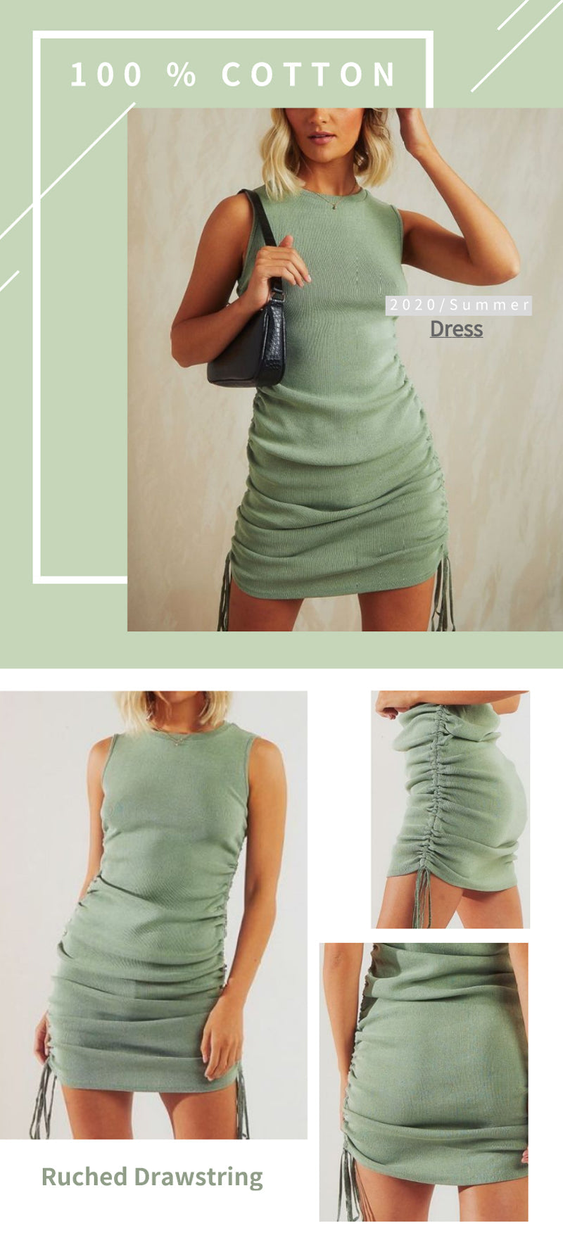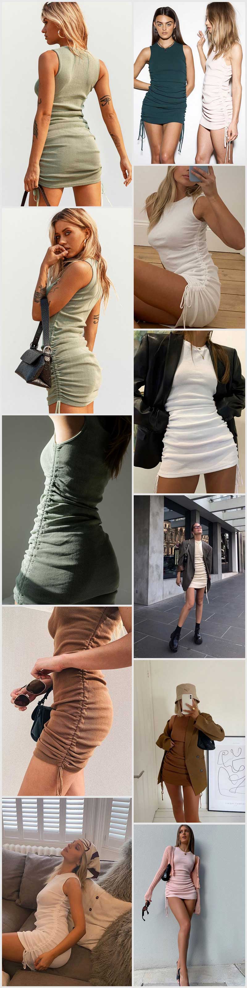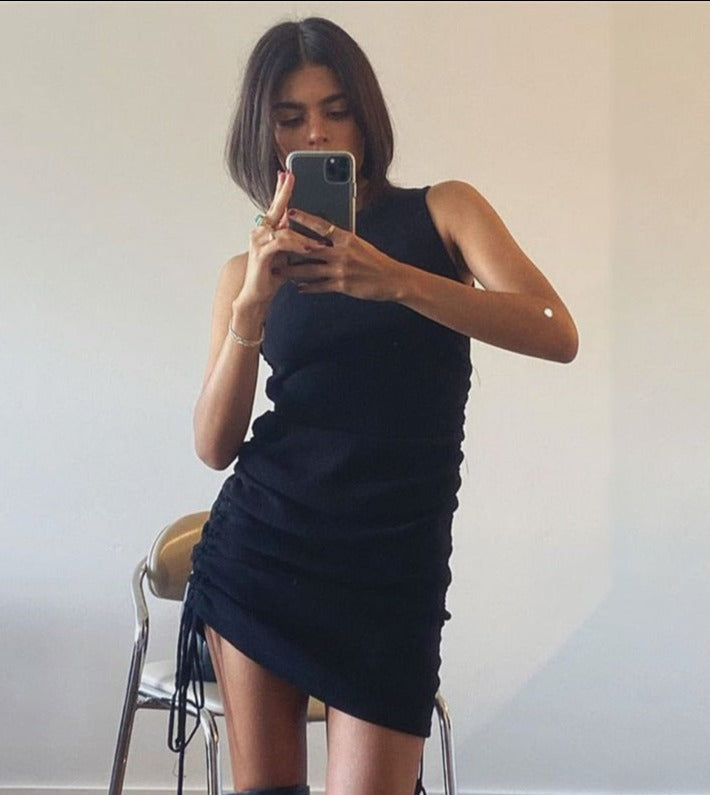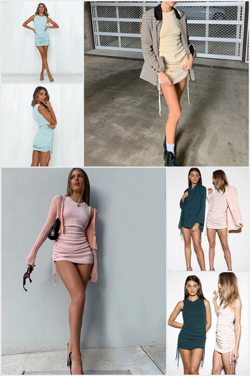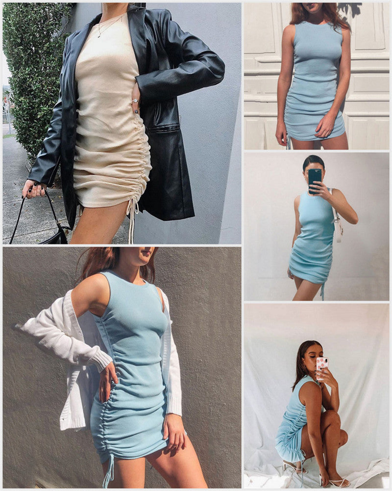 Sixsr Cotton Ruched Drawstring Sexy Party Dress Women Sleeveless Elastic Mini Dress Vintage Summer Bodycon Club Wear Vestidos