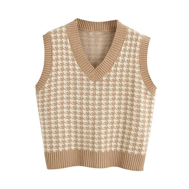 Sixsr Fashion Women Knitted Vest Pullovers V Neck Sleeveless Houndstooth Knitted Jumper Pullovers Korean Loose Plaid Sweater Vest