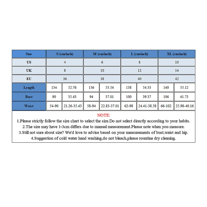 S=US4=EU36=UK8(cm / inch) Length: 134 / 52.76, Bust: 90 / 35.43, Waist: 54-90 / 21.26-35.43