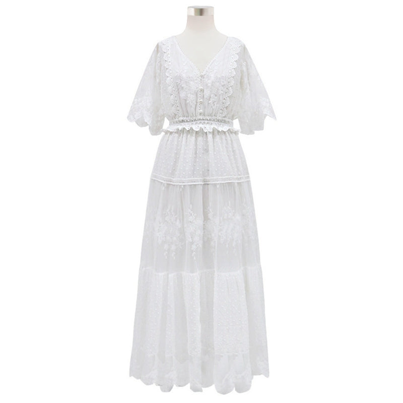 Sixsr Hollow Out White Dress Sexy Women Long Lace Dress Cross Semi-Sheer Plunge V-Neck Short Sleeve Lace Maxi Dress