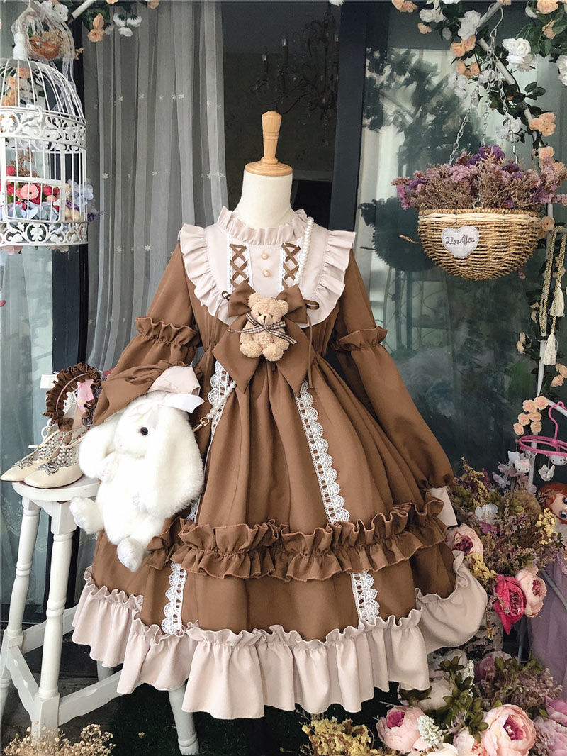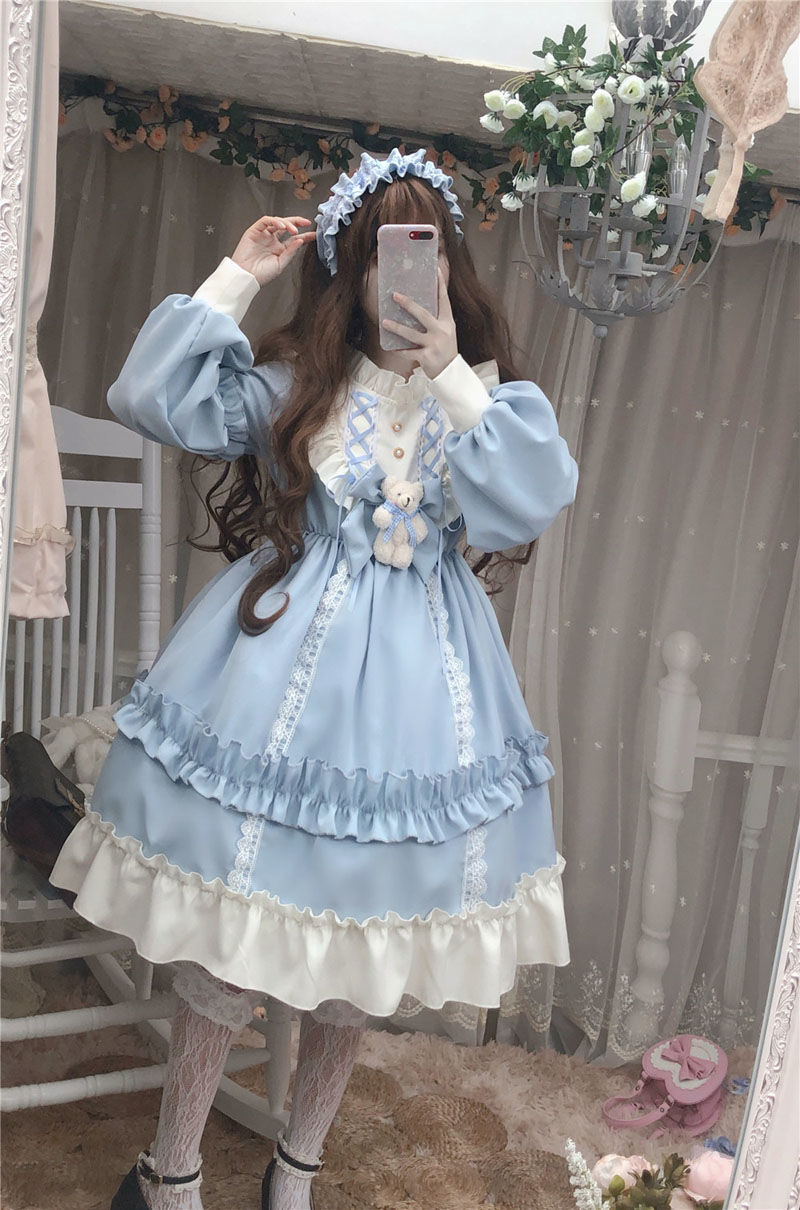Sixsr Japanese Gothic Lolita Dress Women Kawaii Bow Bear Lace Blue Dress Long Sleeve Princess Dress Halloween Costume Gift For Girls
