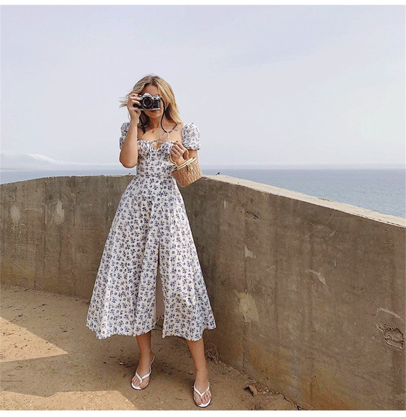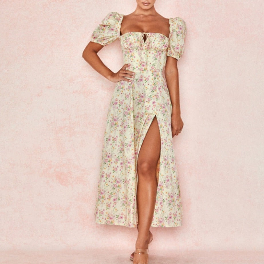 Sixsr Print Summer Dress Women Floral Short Puff Sleeves Square Collar Holiday MIDI Dress Female Drawstring High Slit Dress
