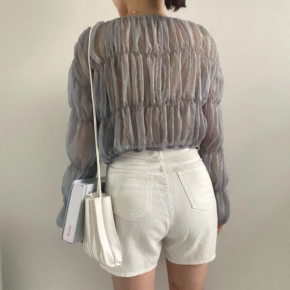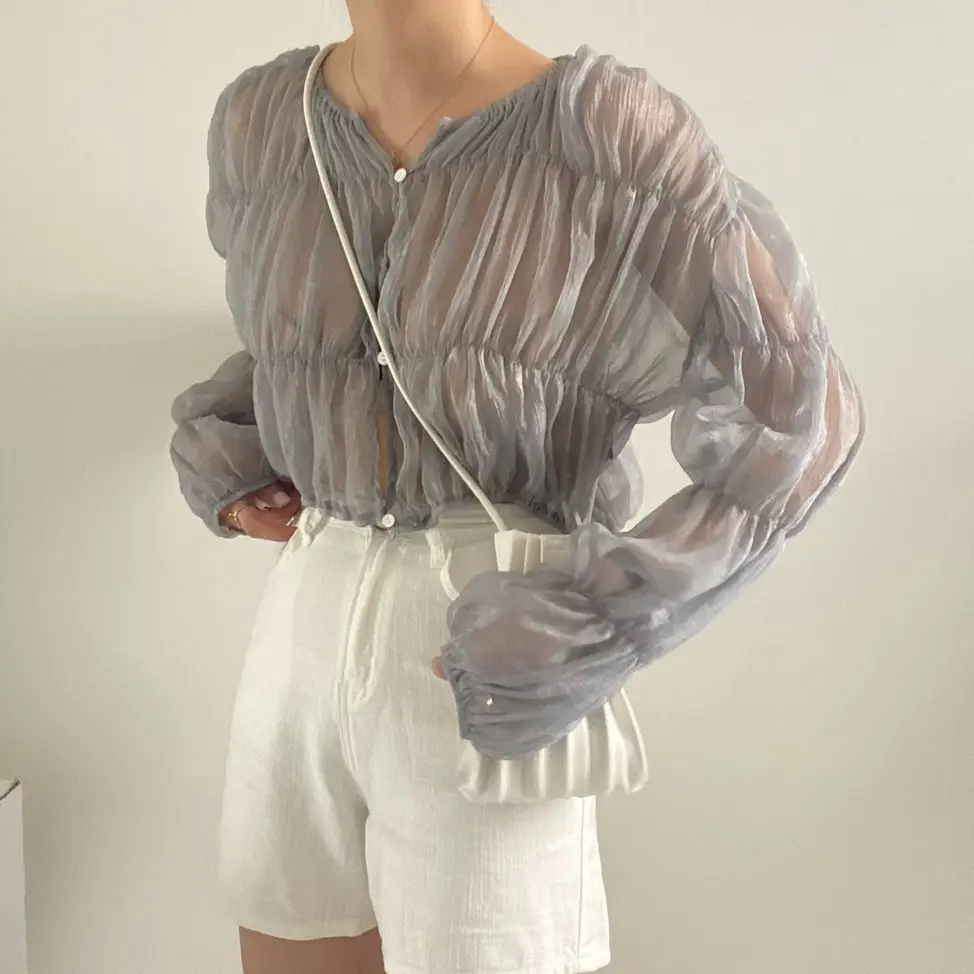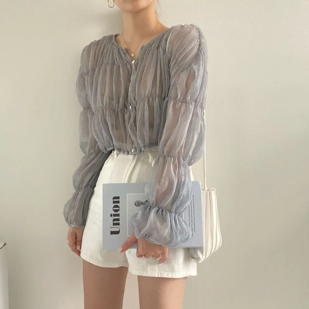 Korean Fashion Pleated Casual Blouse Women Summer New Loose Folds Perspective Chiffon Shirt Long Sleeve Tops Blusas Mujer 15624