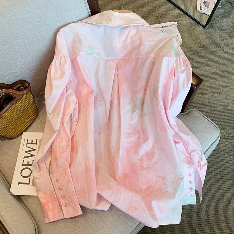 Korean Fashion Tie Dye Loose Long Sleeve Single Breasted Shirt Spring Women's Turn-Down Collar Casual Female Blouse