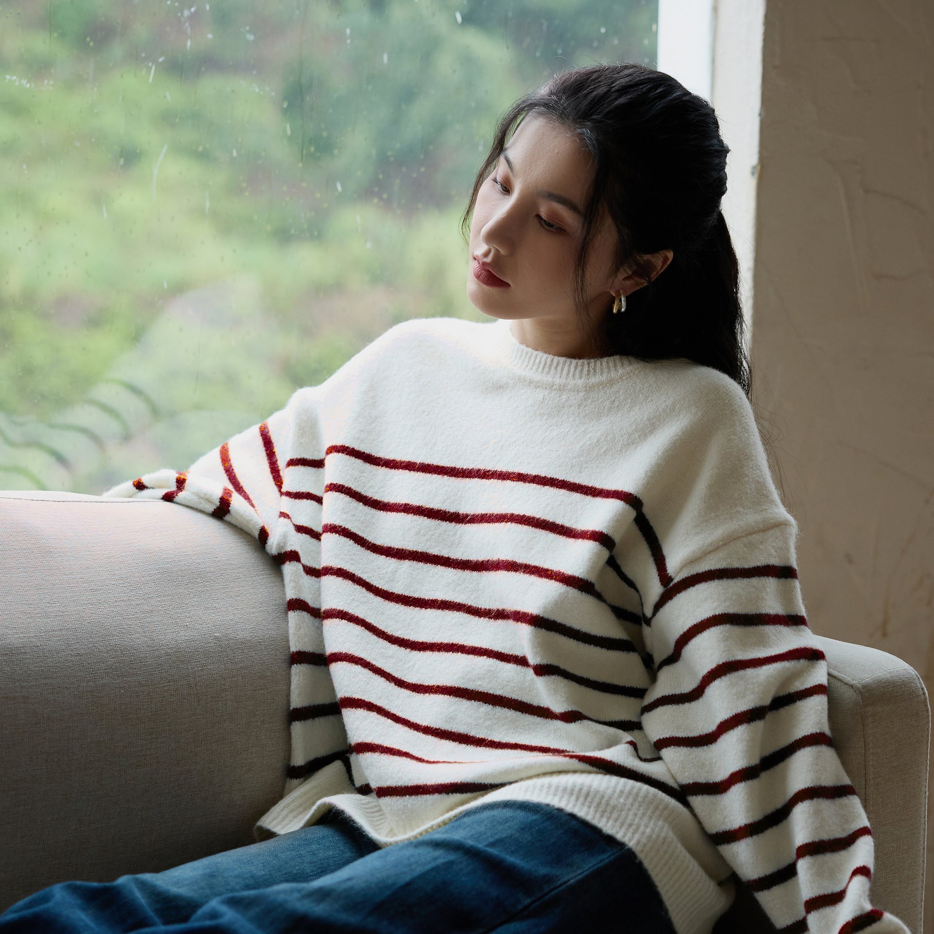 Korean version of classic striped top women's spring contrasting color crew neck knitted sweater fashionable versatile long-sleeved wool jumper