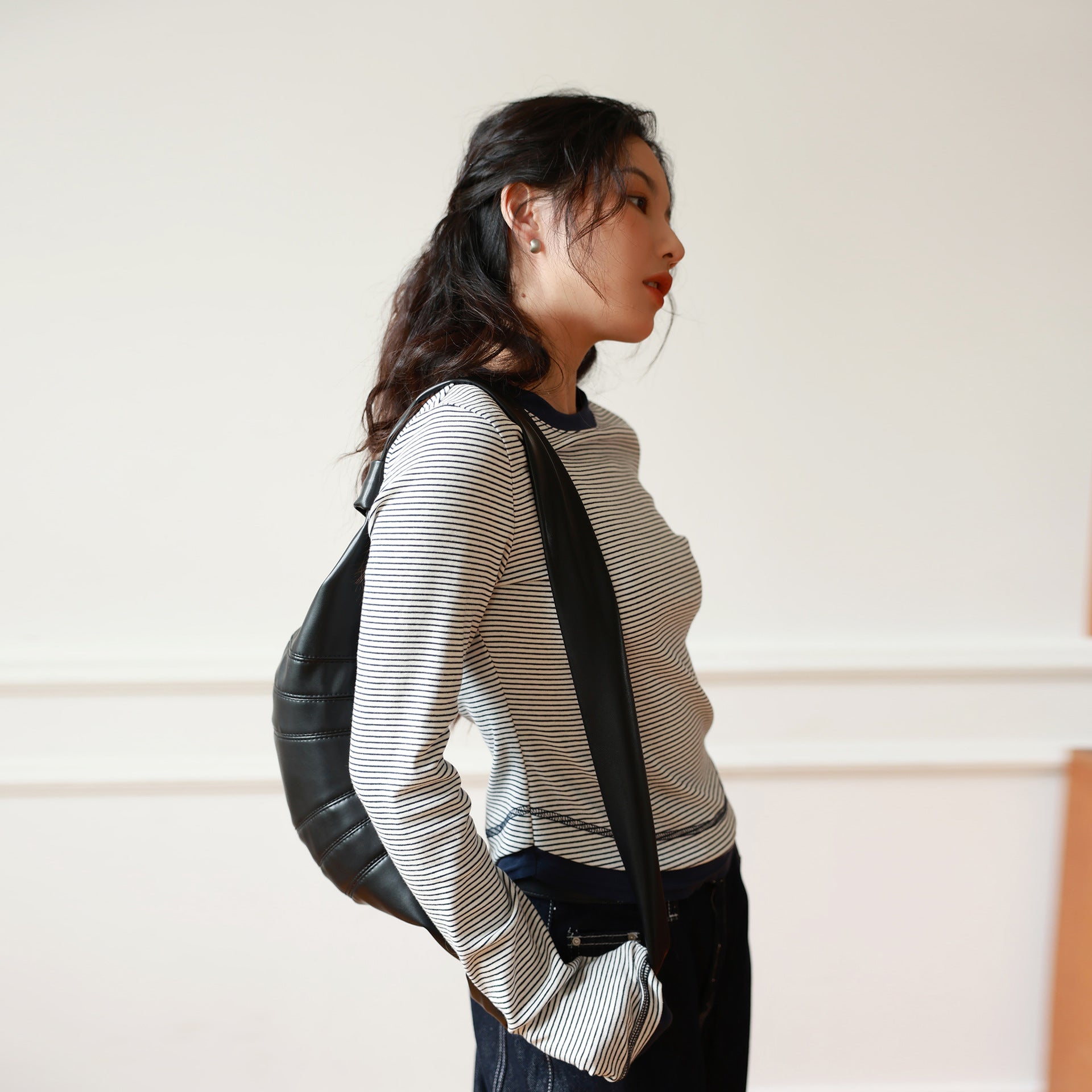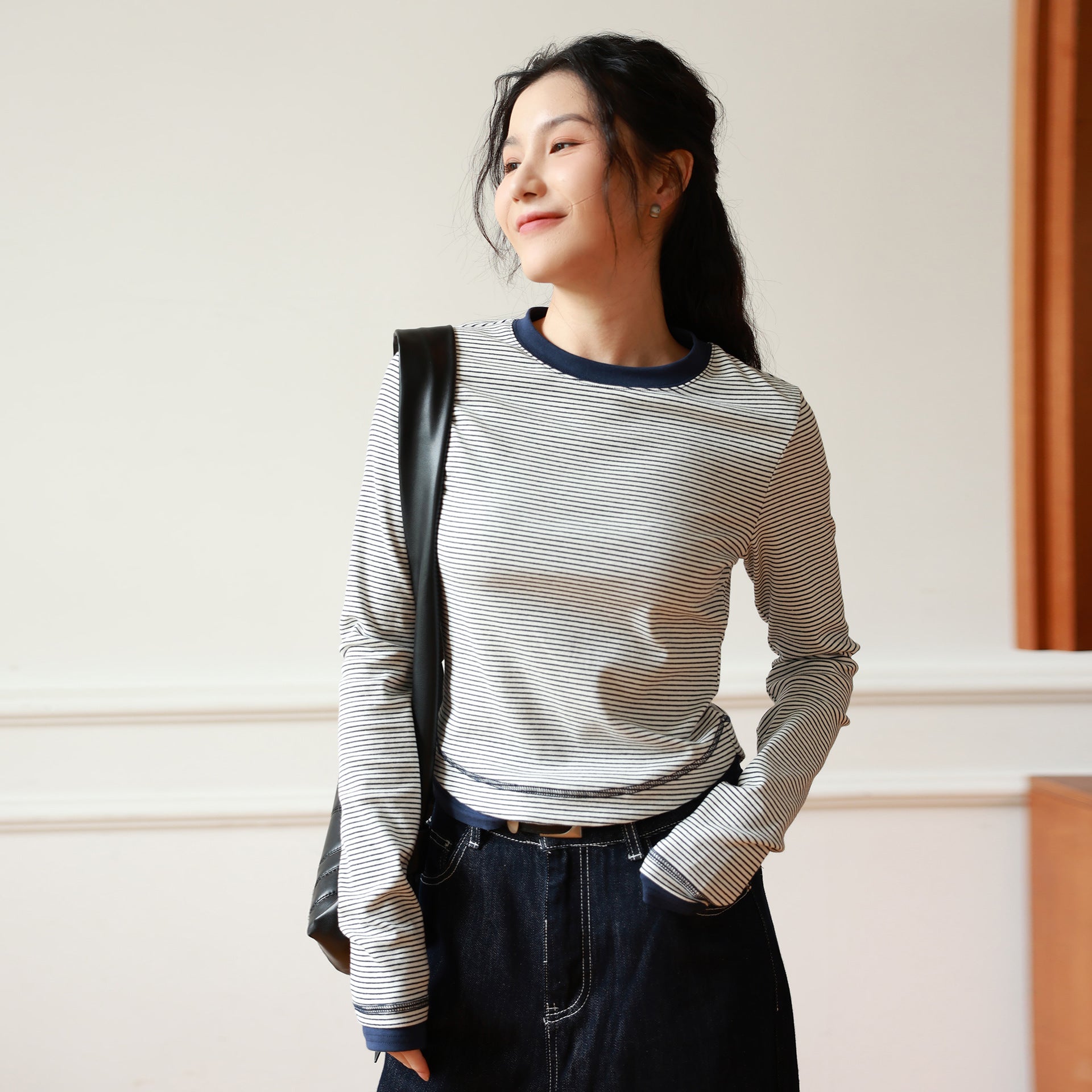 Long-sleeved striped T-shirt women's spring new Japanese and Korean casual fashion versatile jumper contrasting color round neck front shoulder top