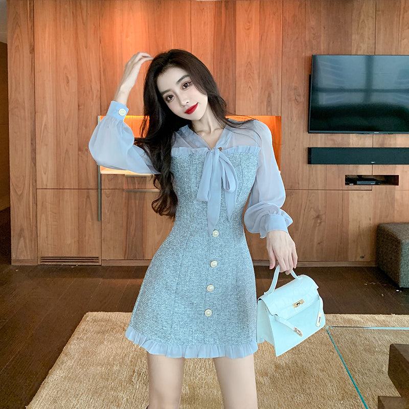 Sixsr New Spring Vintage Sexy See-through Chiffon Patchwork Tweed Mini Dress Women Ribbon Bow Single-breasted Long Sleeve Party Dress