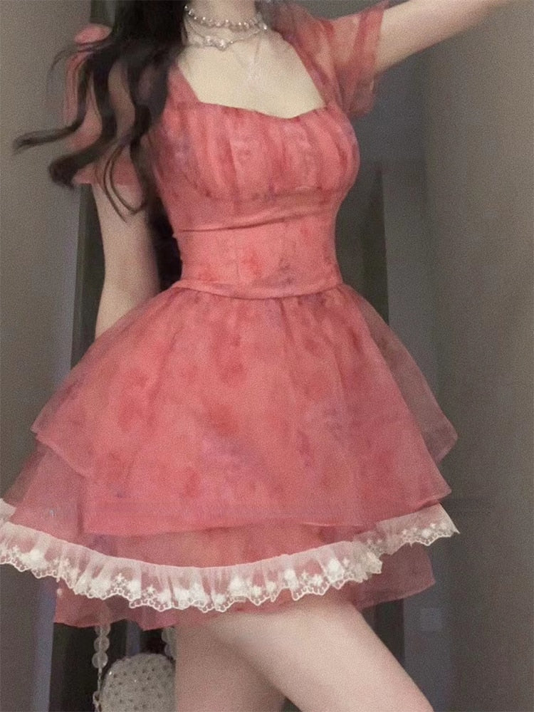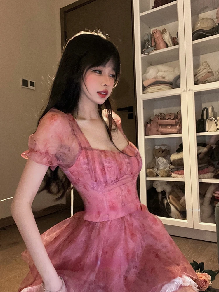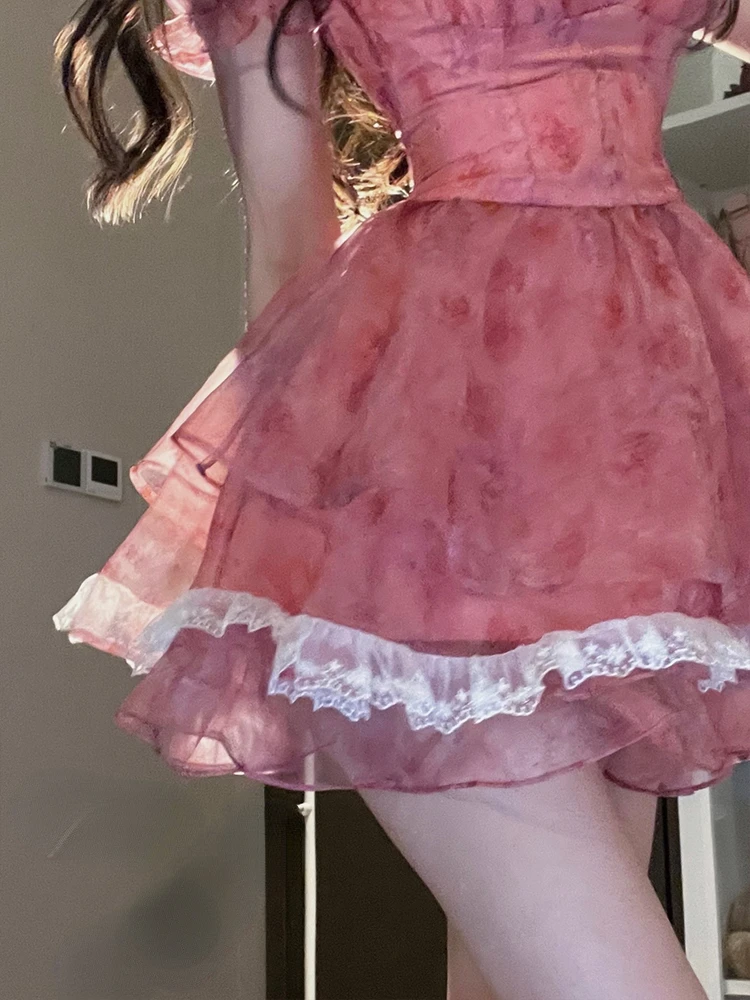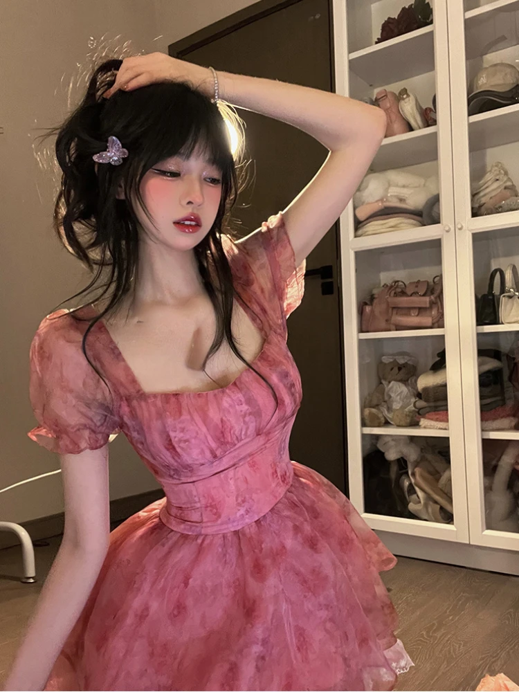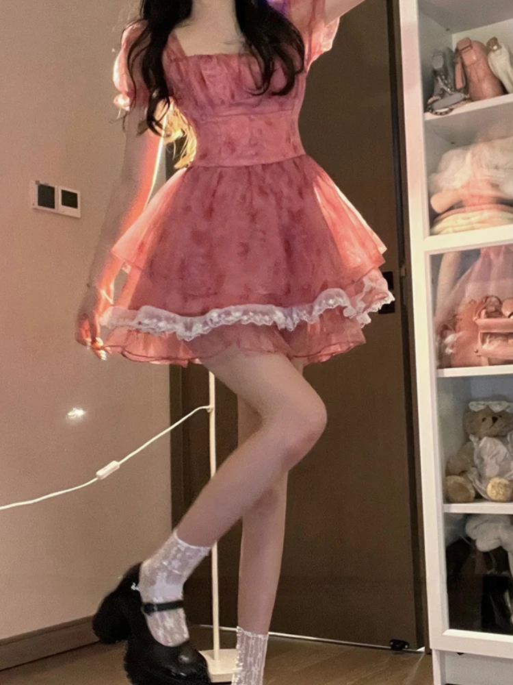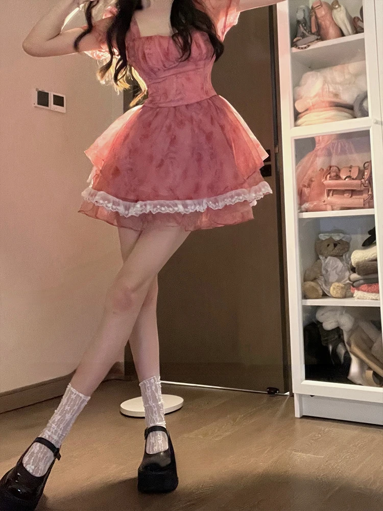 Pink Floral Short Party Dress Sexy Lace Puff Fairy Kawaii Clothing Mini Dress Fashion Birthday Lolita Dress Women Summer