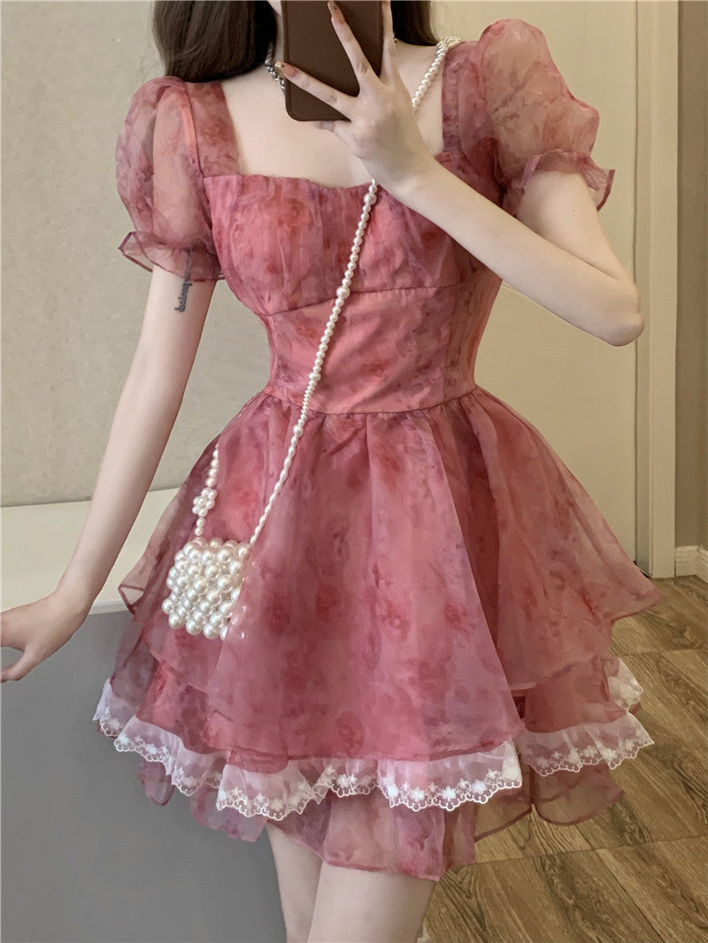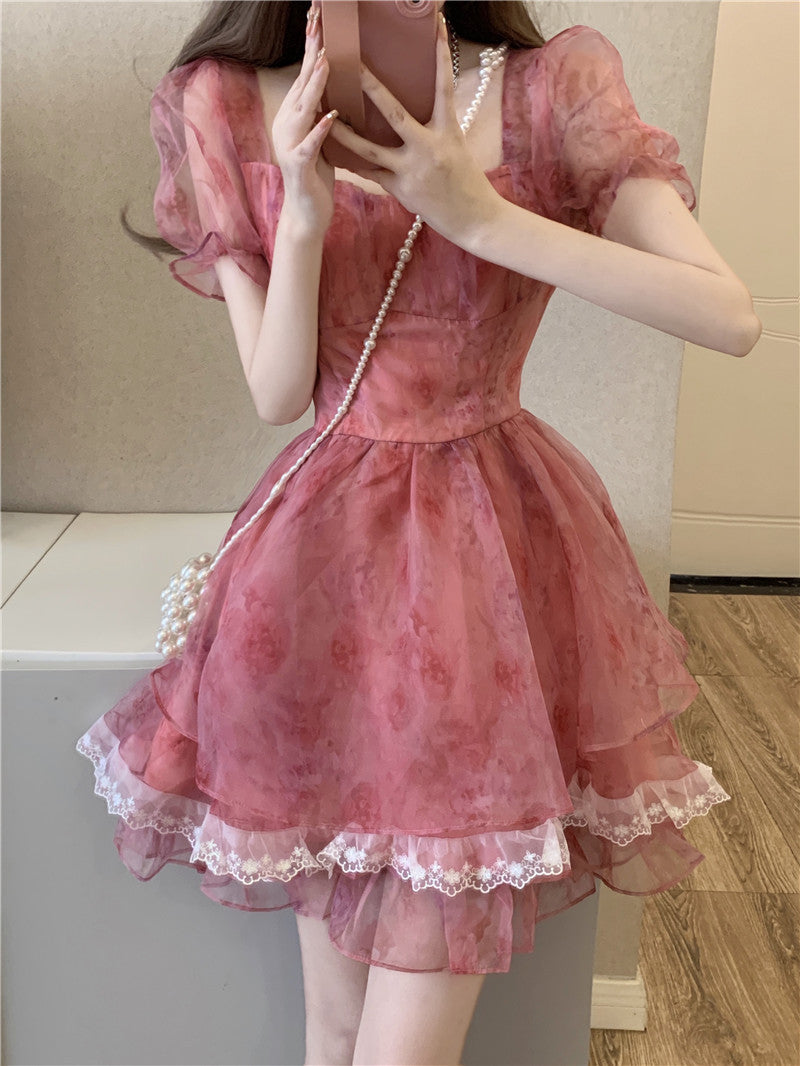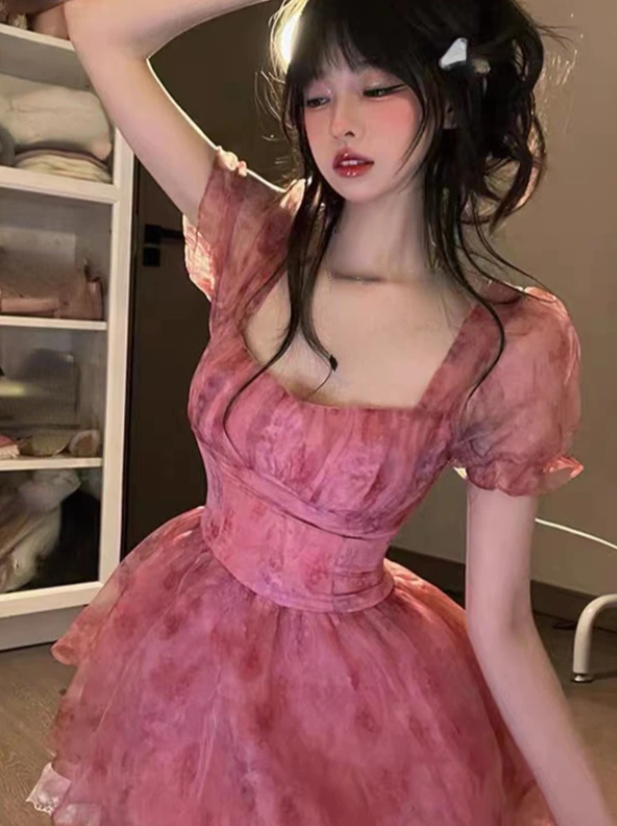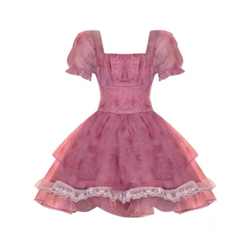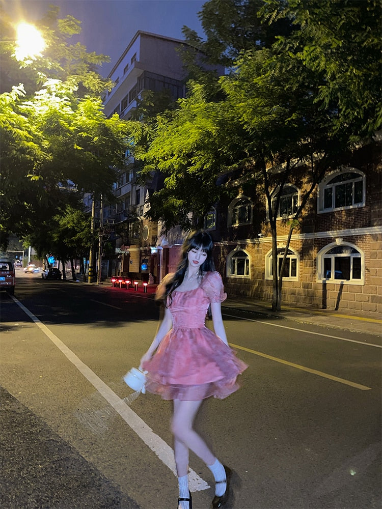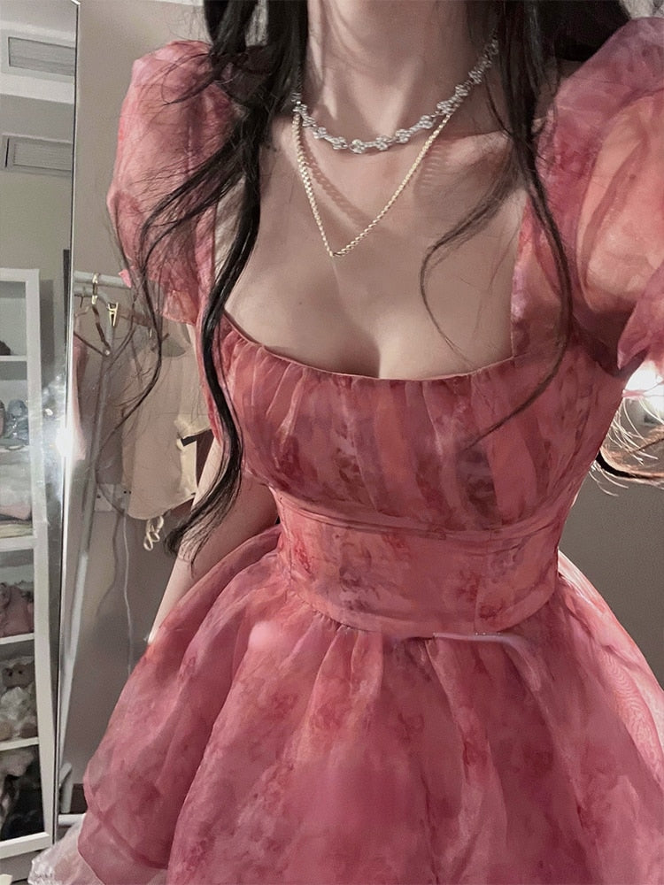 Pink Floral Short Party Dress Sexy Lace Puff Fairy Kawaii Clothing Mini Dress Fashion Birthday Lolita Dress Women Summer
