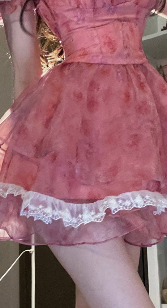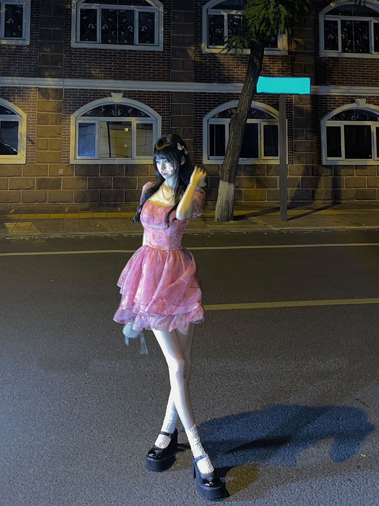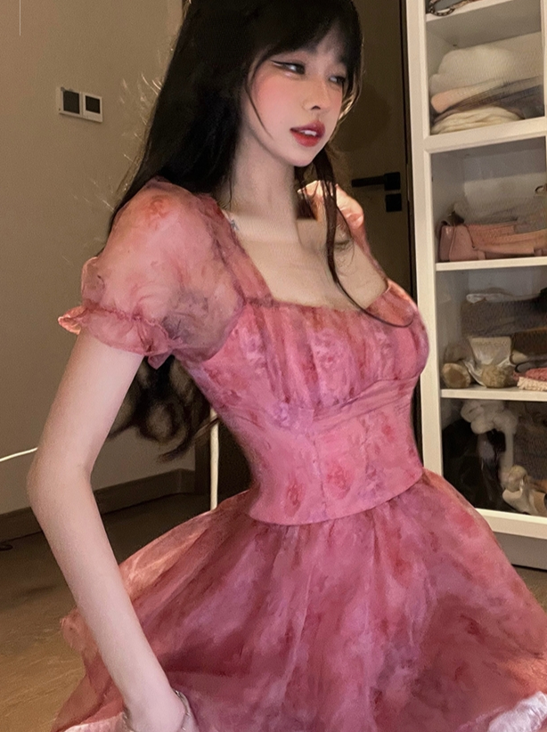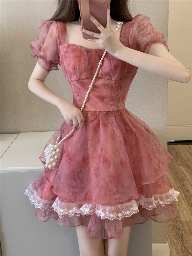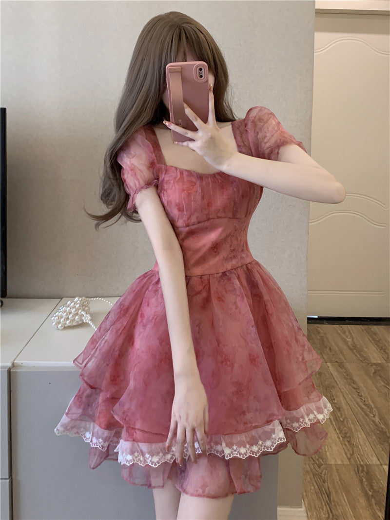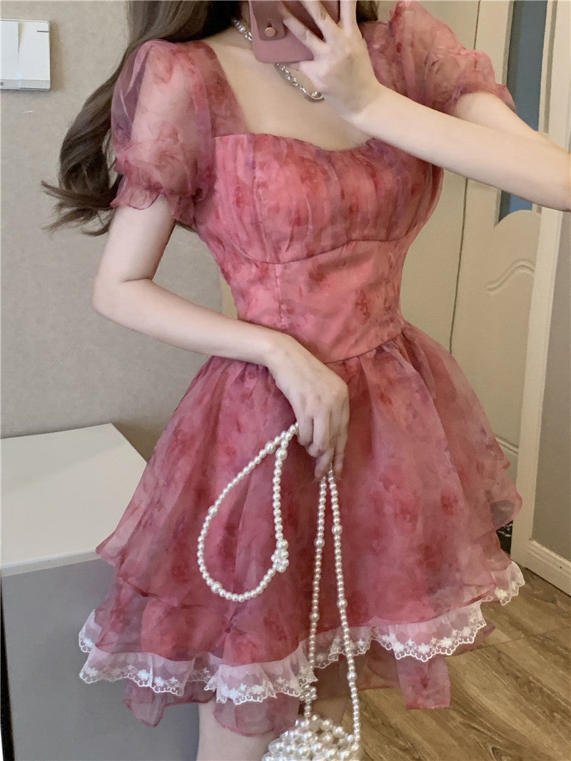 Pink Floral Short Party Dress Sexy Lace Puff Fairy Kawaii Clothing Mini Dress Fashion Birthday Lolita Dress Women Summer