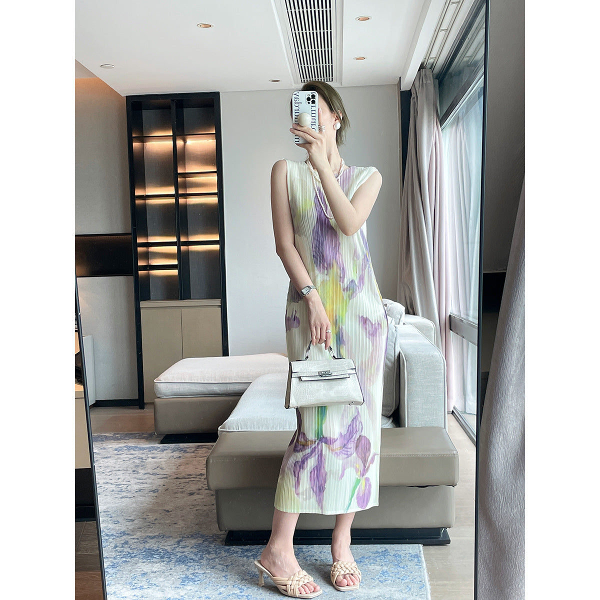 Pleats summer new national style printed sleeveless Miyake dress temperament advanced sense slim and thin dress