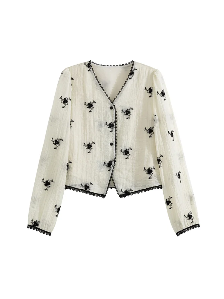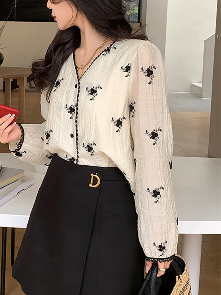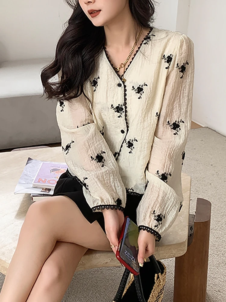 Printed Shirt for Women Spring New Long Sleeve V Neck Vintage Elegant Blouse Fashion Casual Button Up Y2k Top
