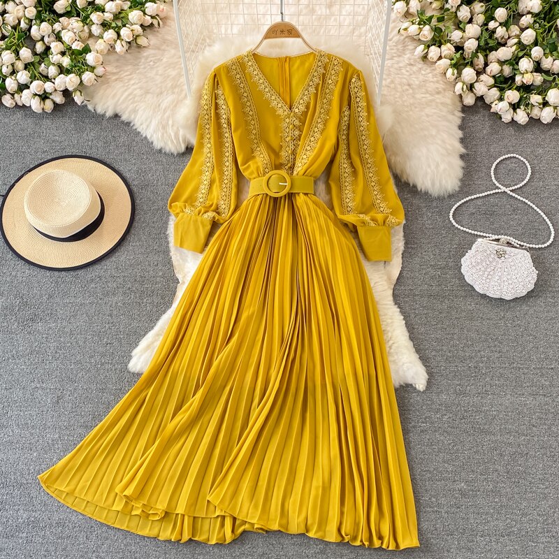 Sixsr Red/Yellow/Black Embroidered Pleated Long Dress Vintage V-Neck Lantern Long Sleeve High Waist Draped Maxi Vestidos Female