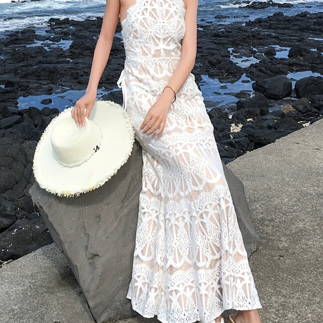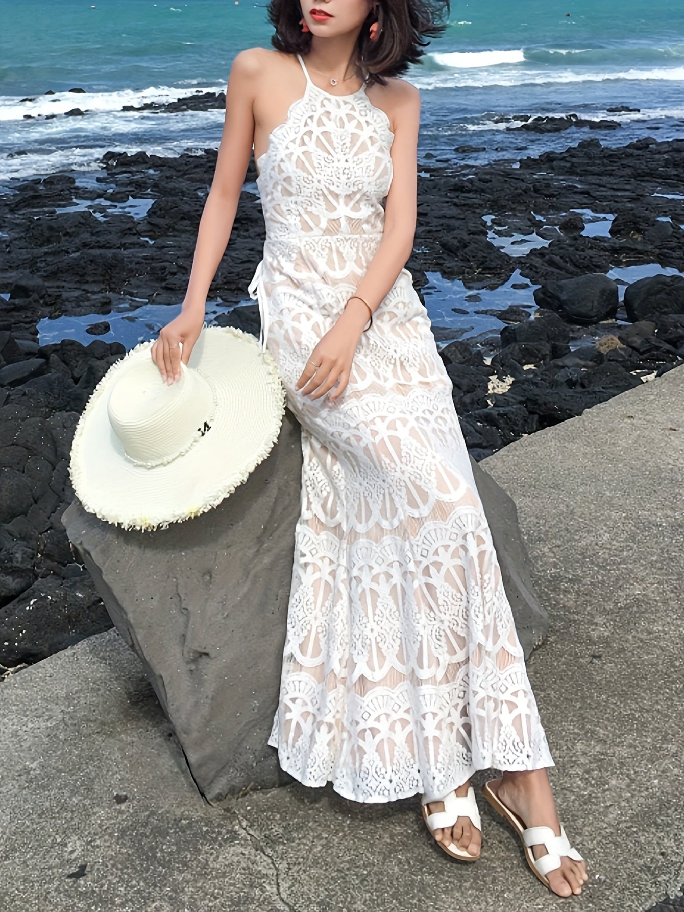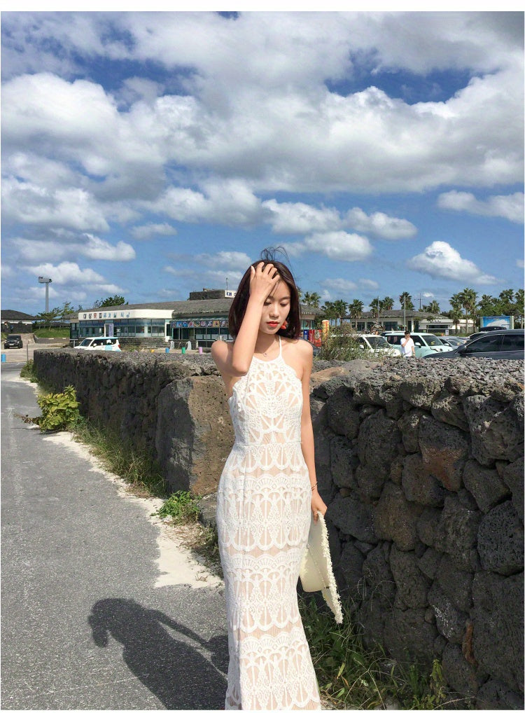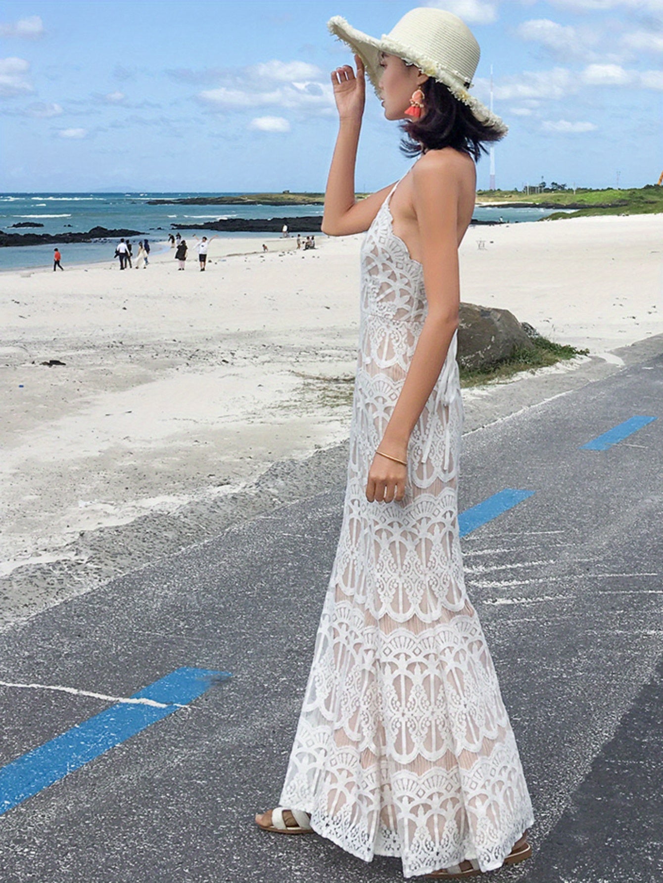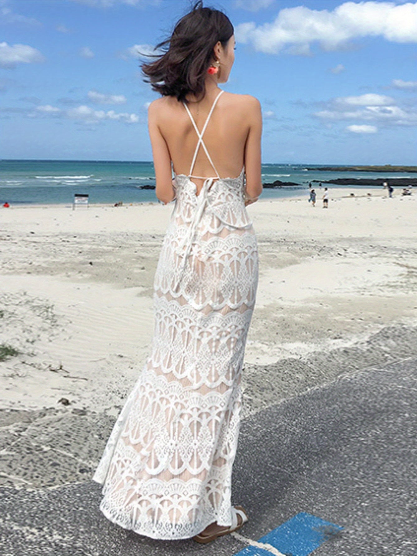 Scallop Trim Crew Neck Dress, Vacation Style Backless Cross Spaghetti Strap Sheath Dress For Spring & Summer, Women's Clothing