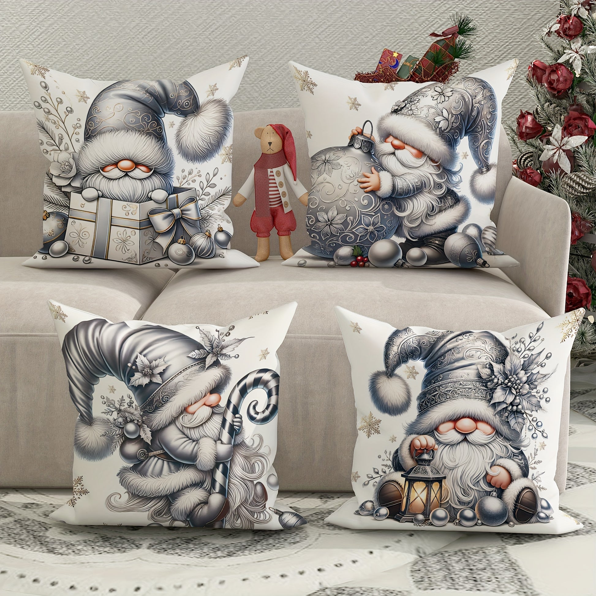 Set of 4 Christmas Gnome and Poinsettia Decorative Cushion Covers, 18x18 Inch, Contemporary Style Zippered Cases for Sofa and Living Room, Machine Washable, 100% Polyester, Woven Fabric Inserts Not Included