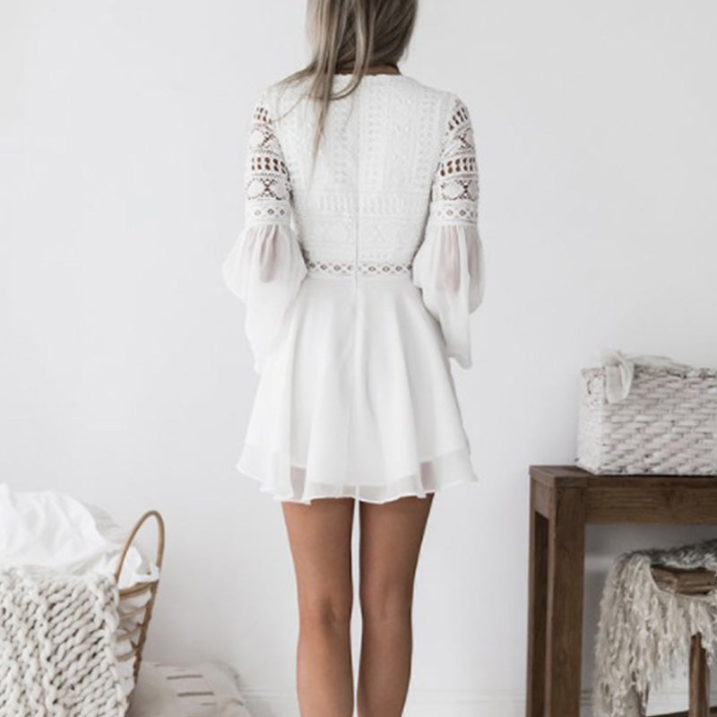 Sixsr Sexy Crochet Lace V-Neck Mini Dress Summer Flare Sleeve Chiffon Beach Sundress Elegant Women Dress Party Sexi