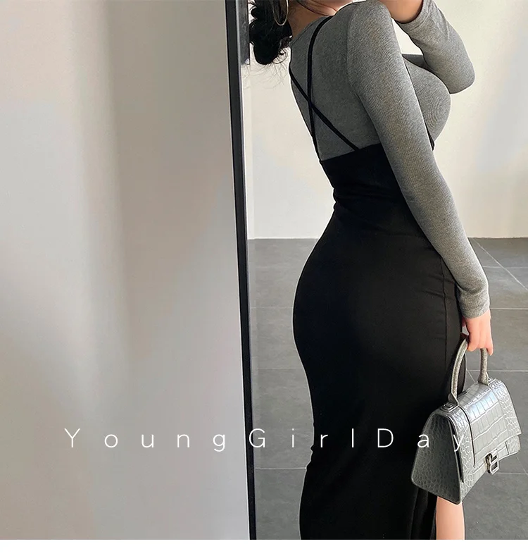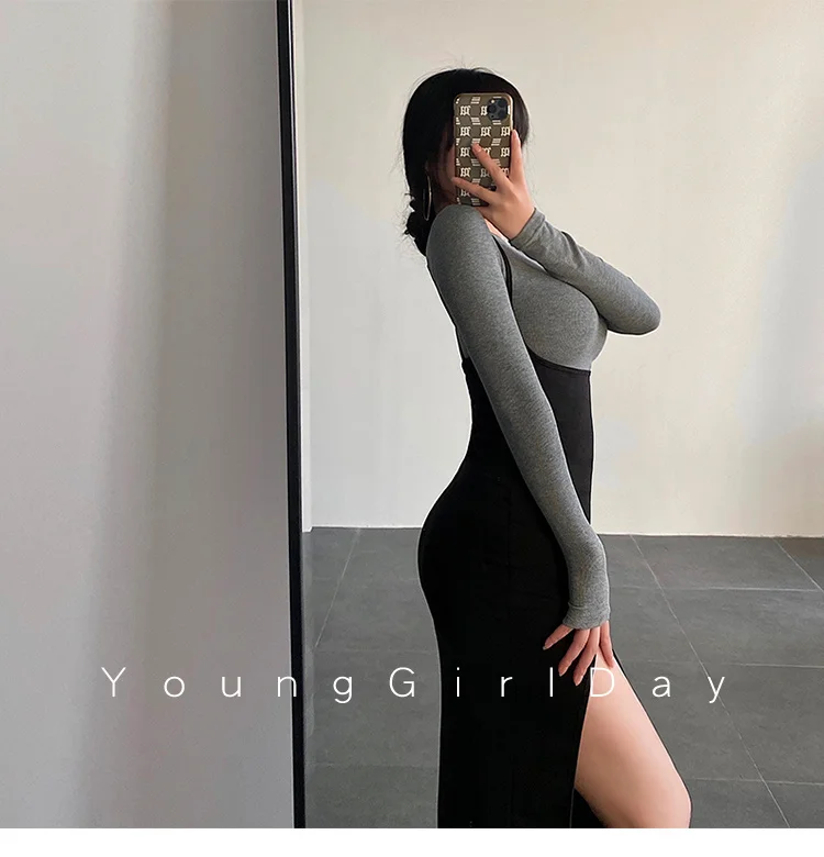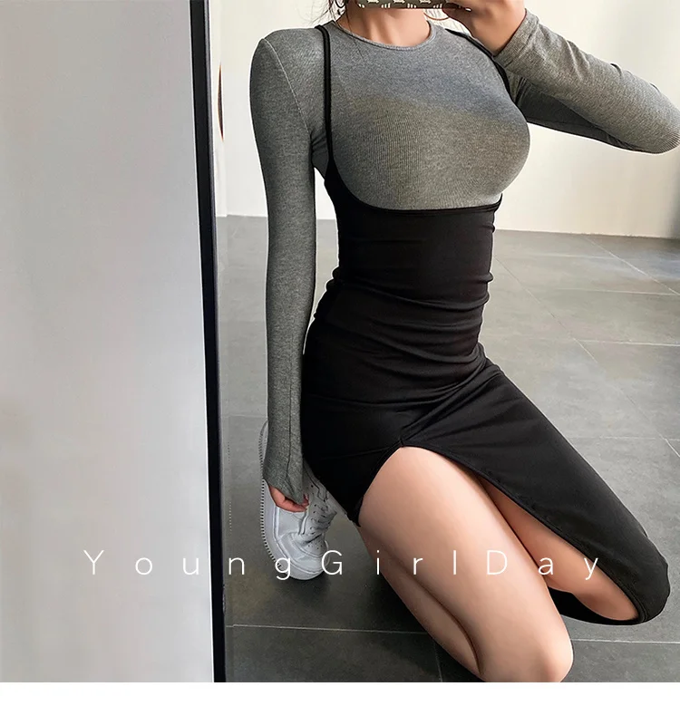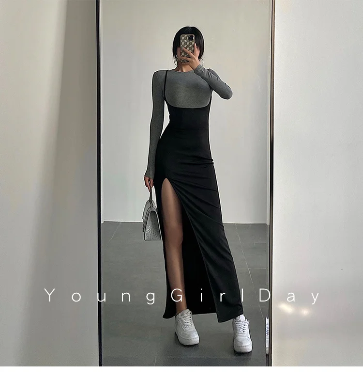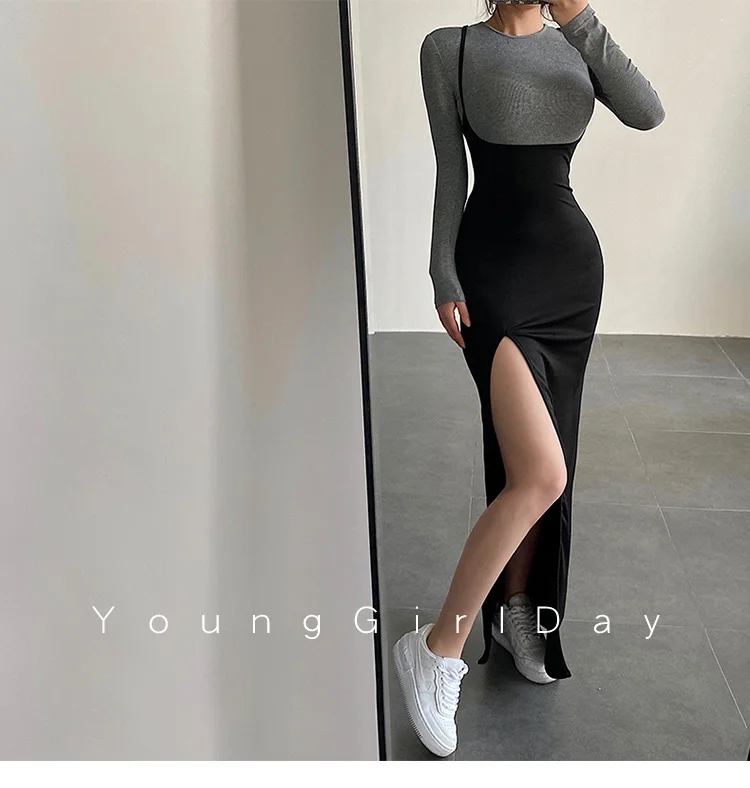 Sexy Split Design Dress Set Autumn Spring Long Sleeve T-Shirt Women Two Piece Set Elastic Slim 2 Piece Suit Y2K