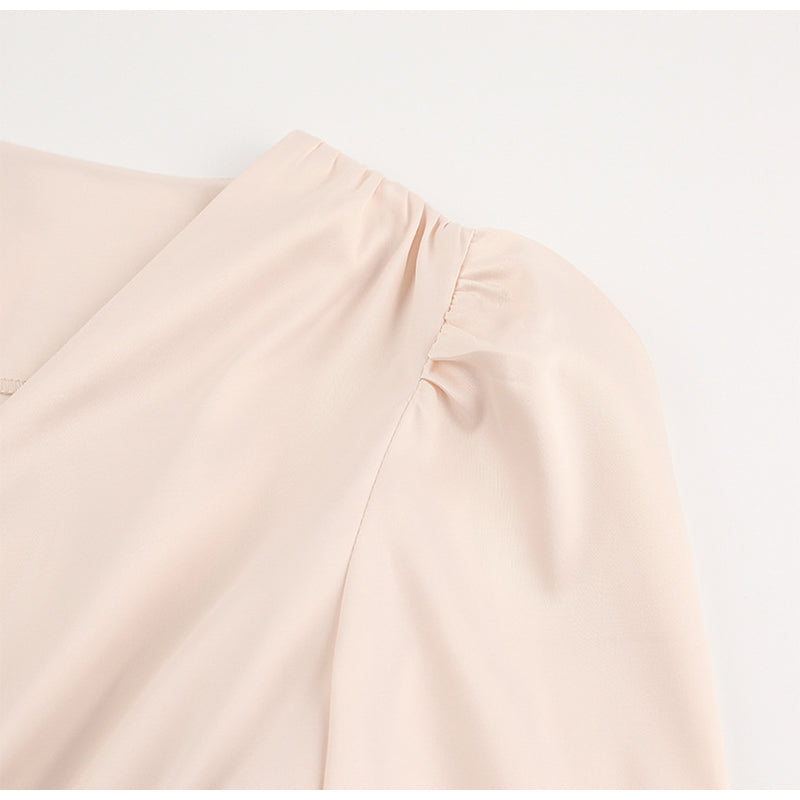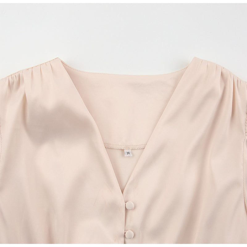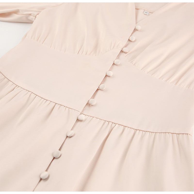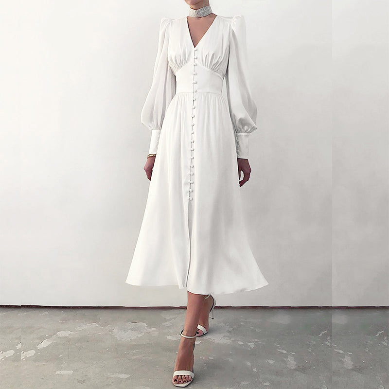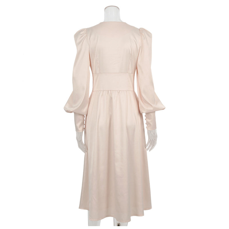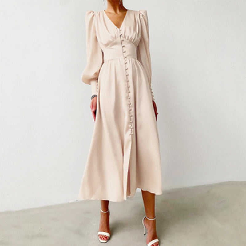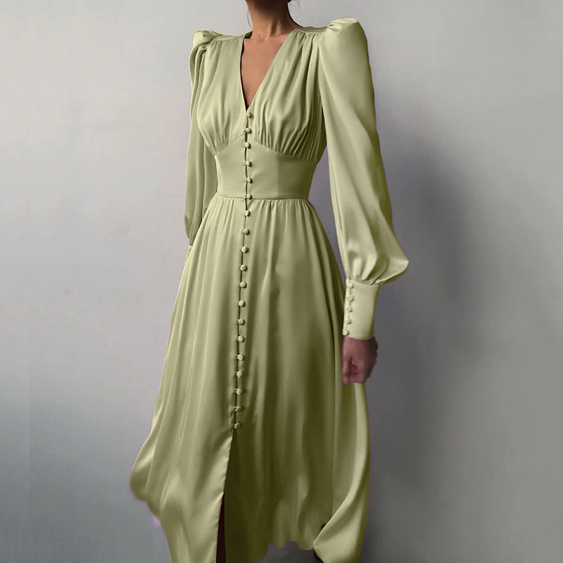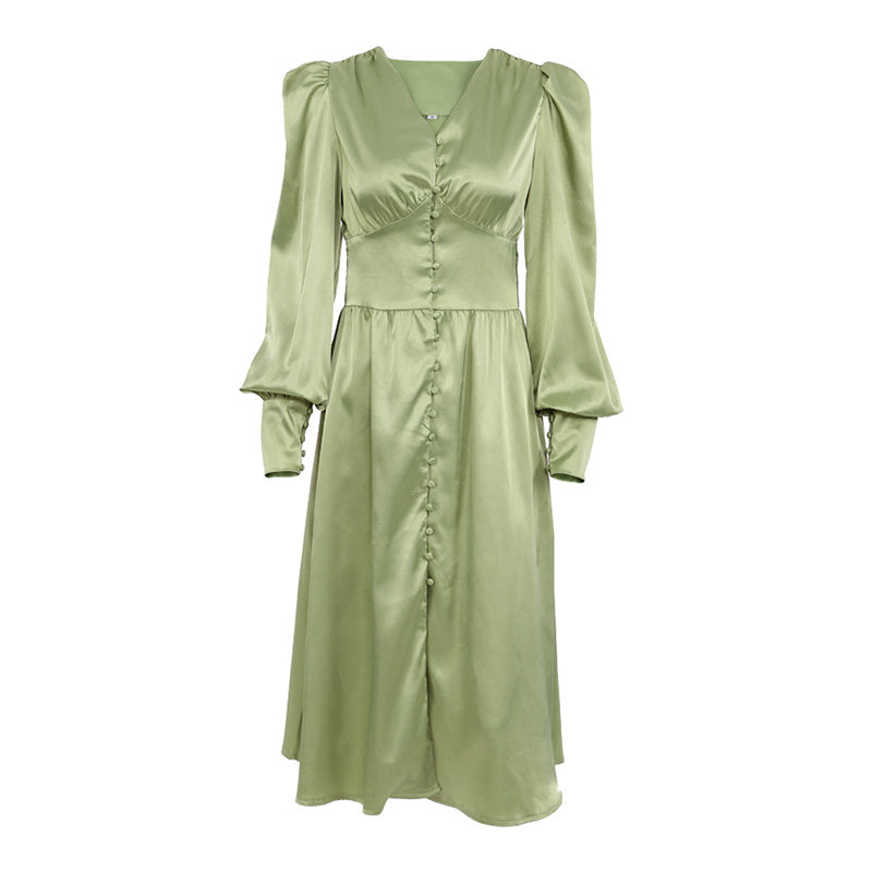 Sixsr Elegant spring satin bishop sleeve a-line dress women V-neck high waist button dress solid Vintage long dresses chic