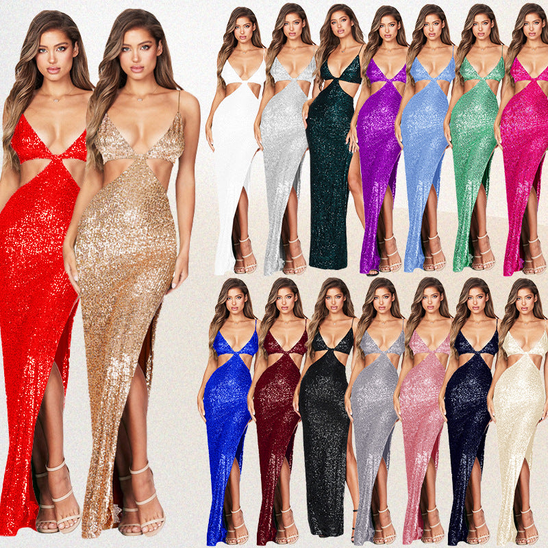 SIXSR 2025 2025 trade women's sequined backless dress, pure wind split suspender hollow dress women
