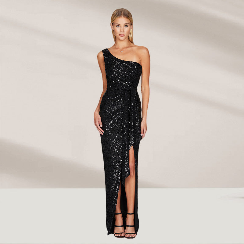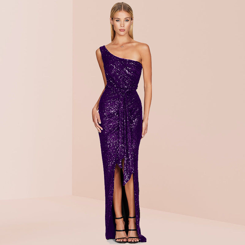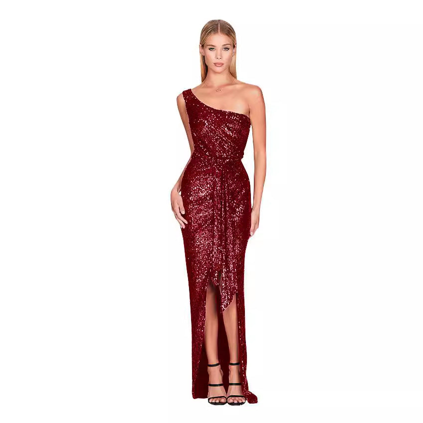 SIXSR 2025 OEM 2025 women's clothing split-ended halter dress independent station single shoulder sequined belt dress women's wholesale