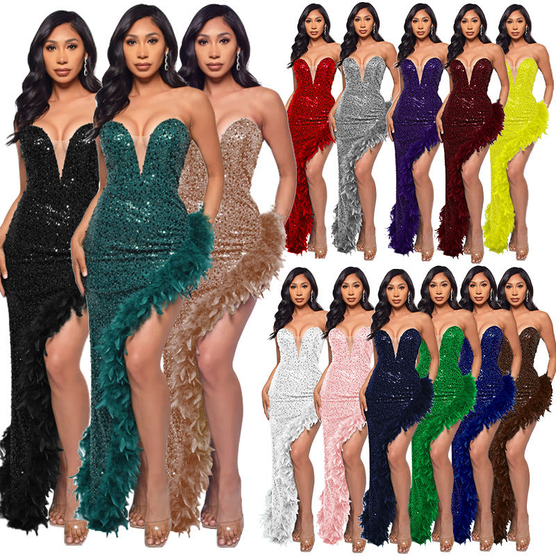 SIXSR 2025 OEM women's summer skirt high-end long dress 2025 trade tube top backless sequined feather dress wholesale
