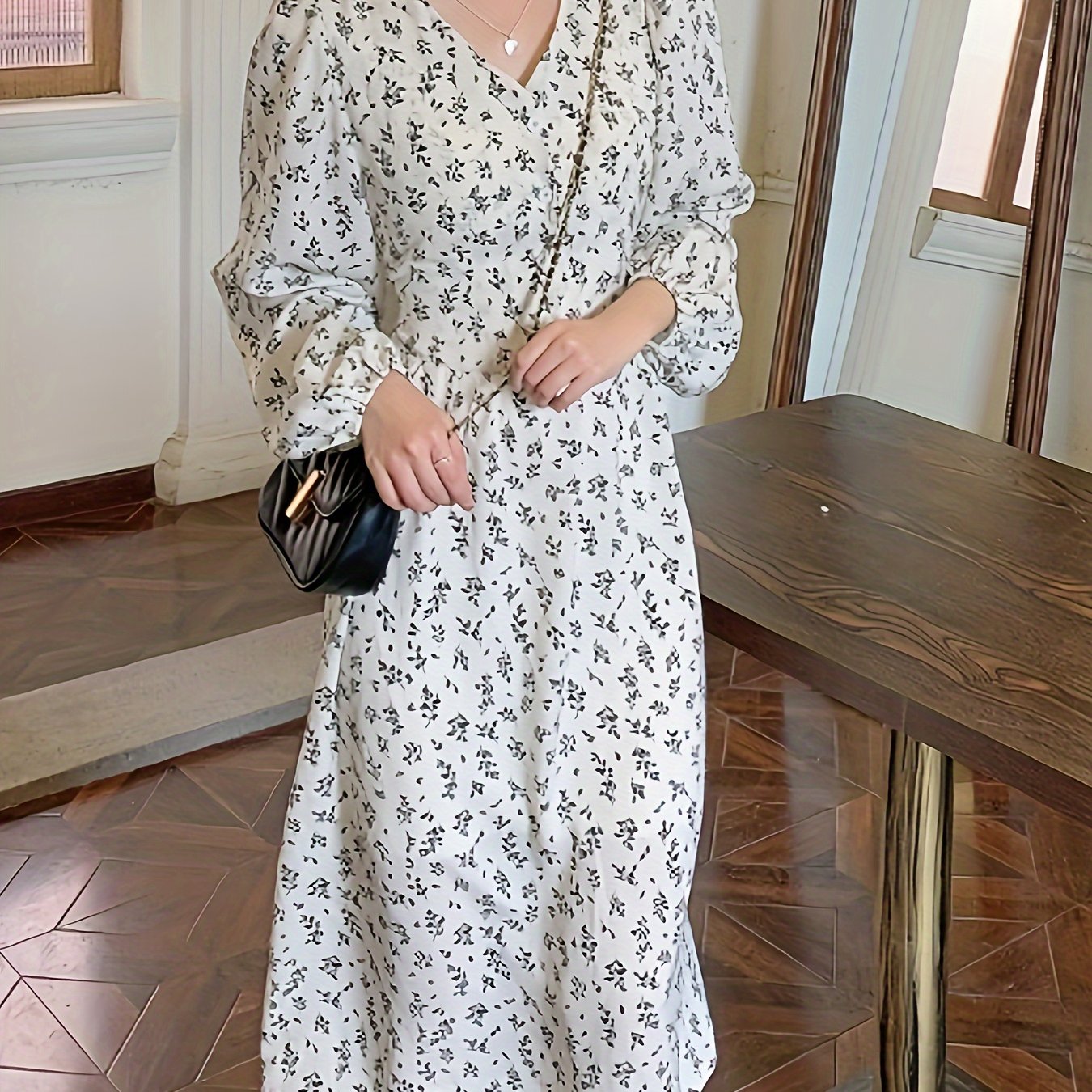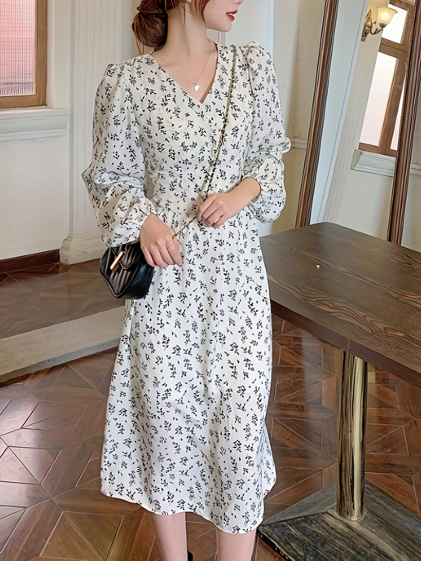 Sixsr Allover Print V-neck Dress, Elegant Long Sleeve Dress For Spring & Fall, Women's Clothing