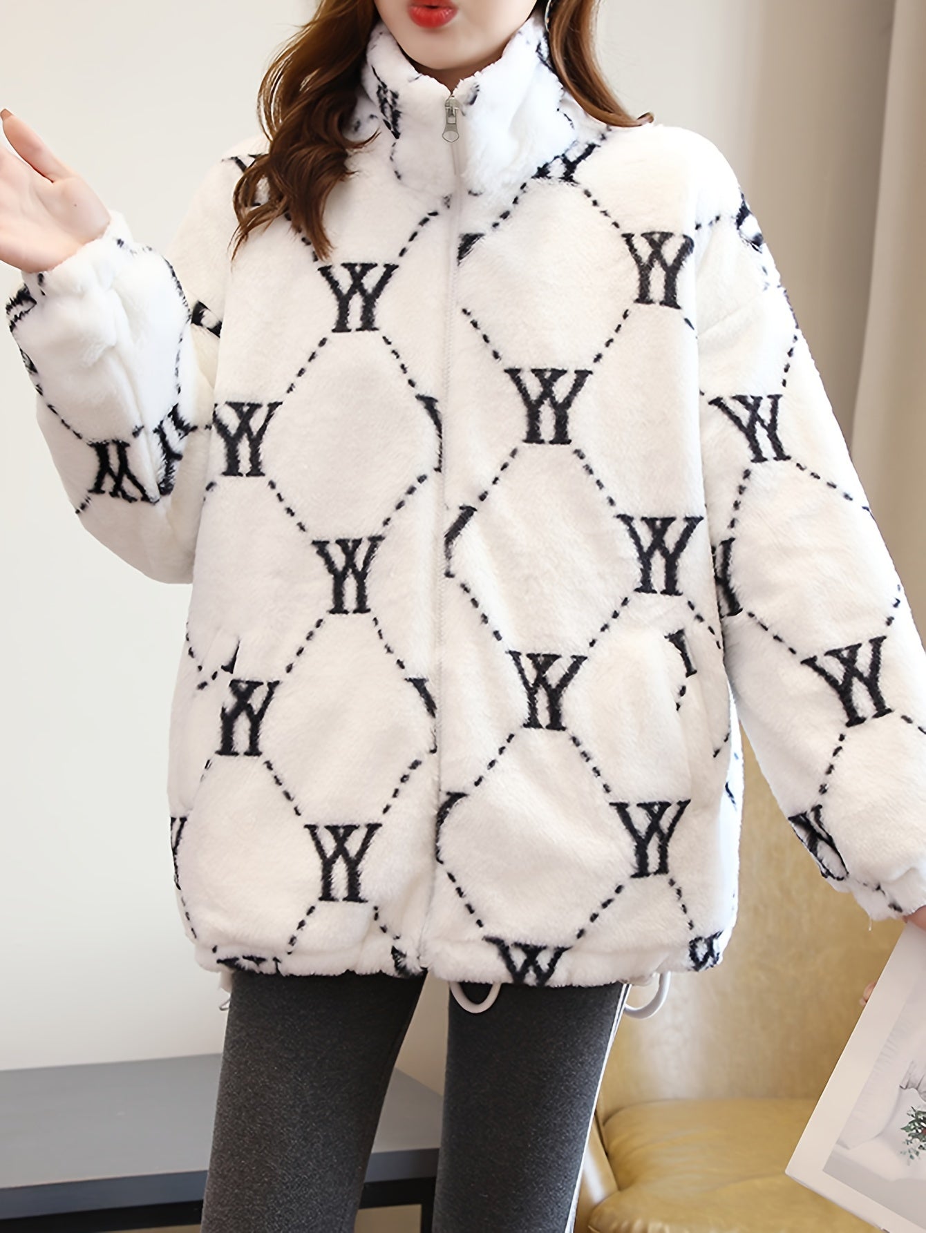 Sixsr Allover Print Zip-up Plush Coat, Casual Thermal Long Sleeve Lapel Coat For Fall & Winter, Women's Clothing