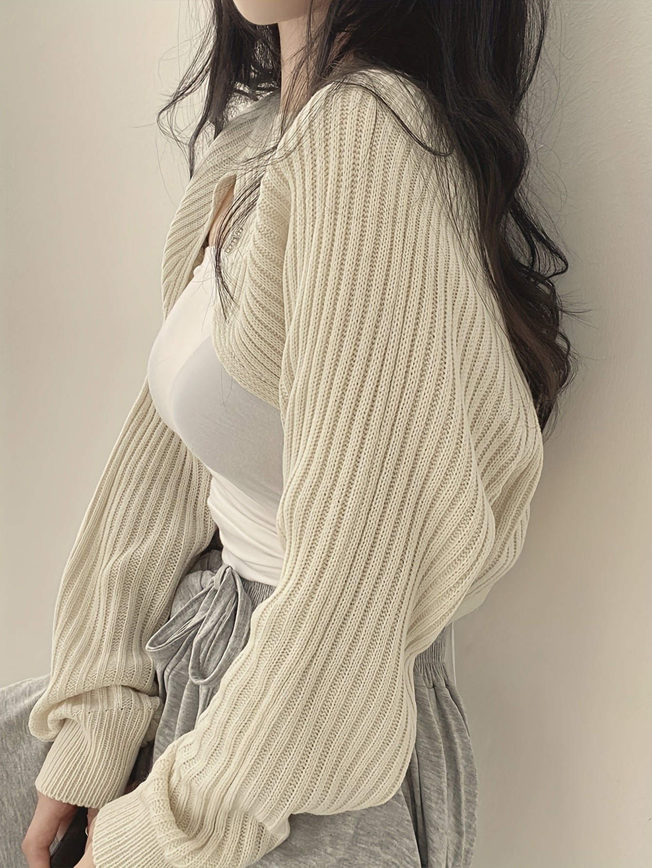 Sixsr Asymmetric Hem Crew Neck Shrug, Chic Long Sleeve Crop Sweater, Women's Clothing