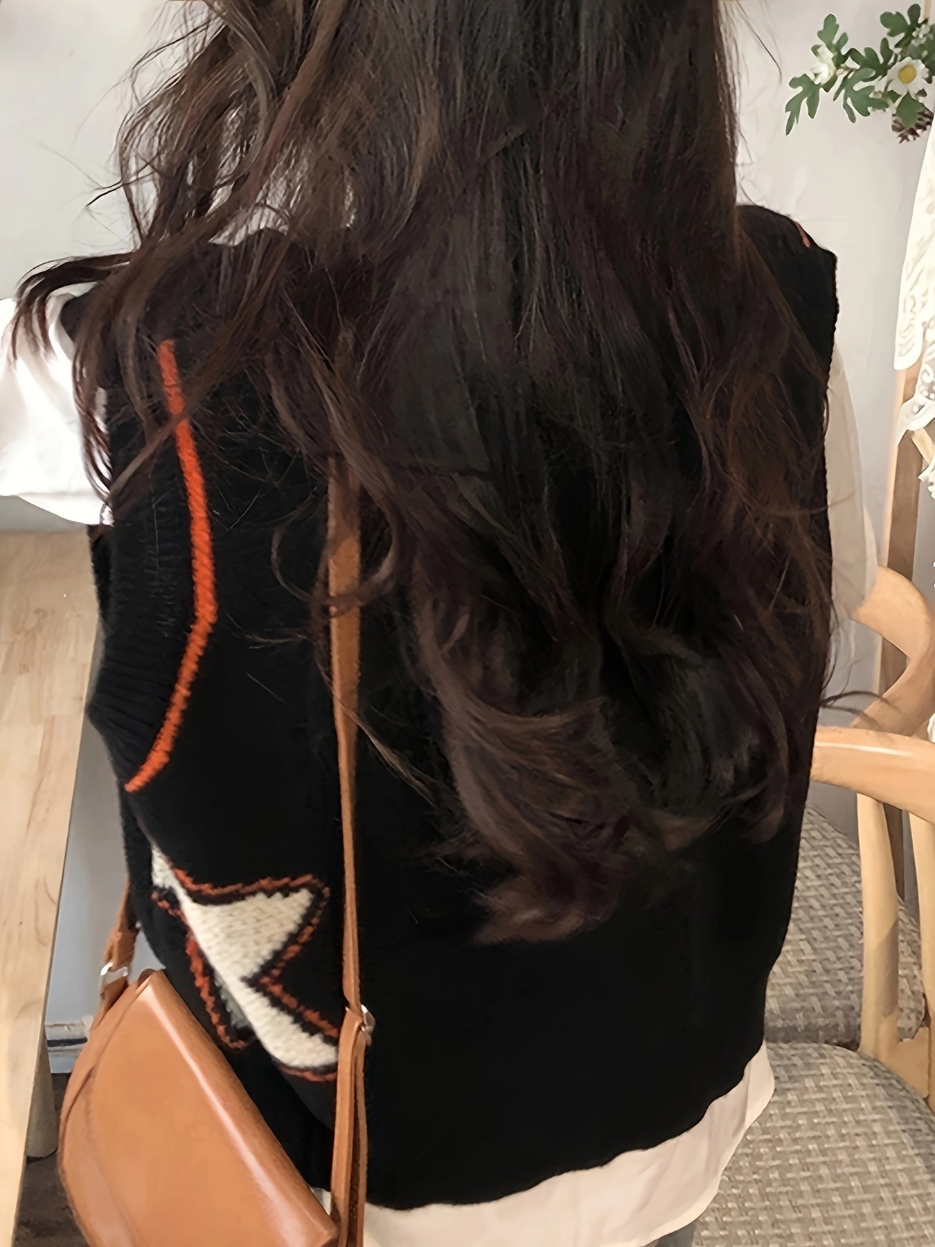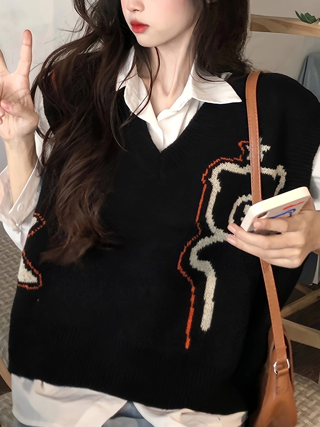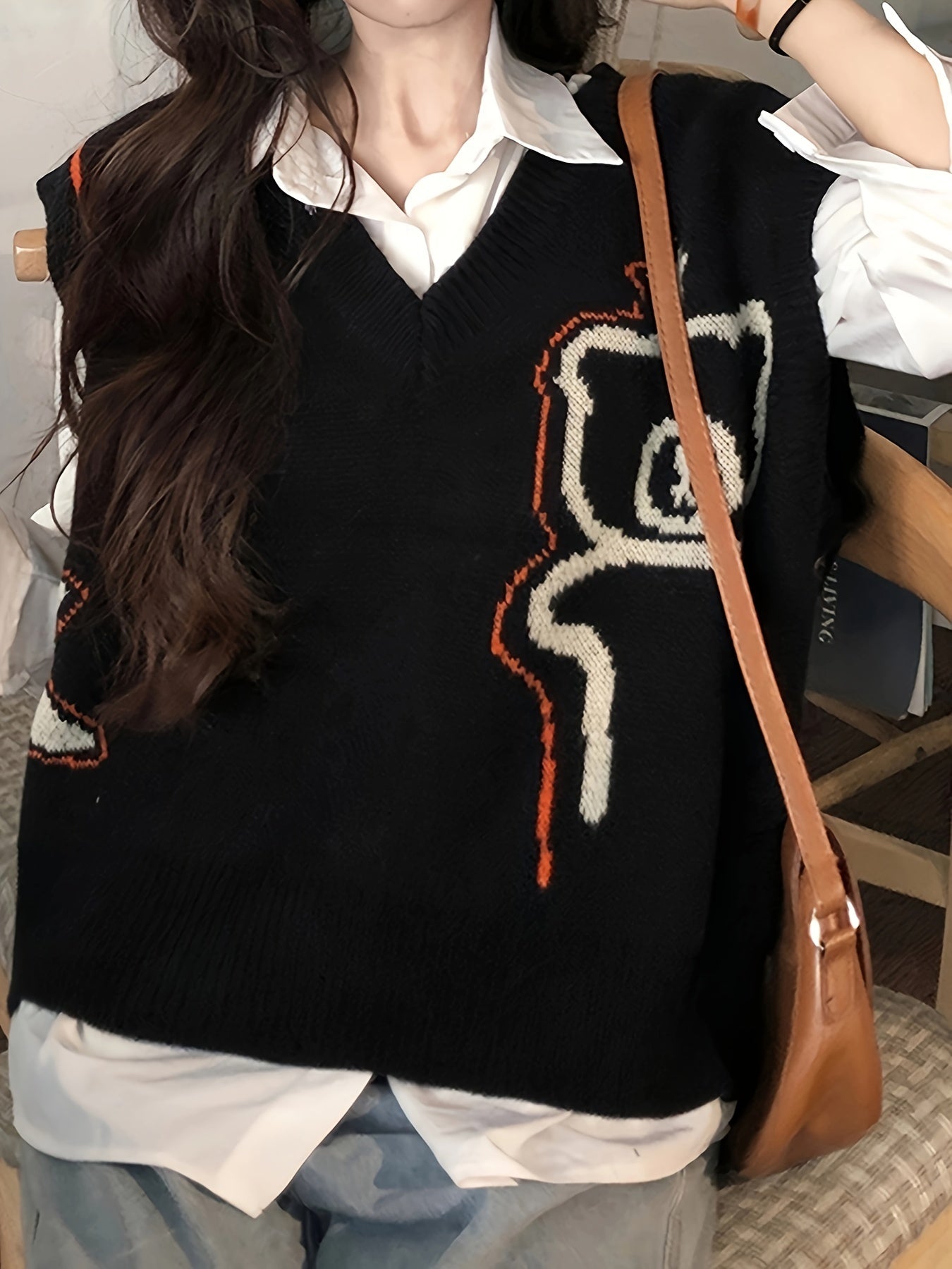 Sixsr Bear Print V Neck Sweater Vest, Casual Sleeveless Vest For Fall & Winter, Women's Clothing