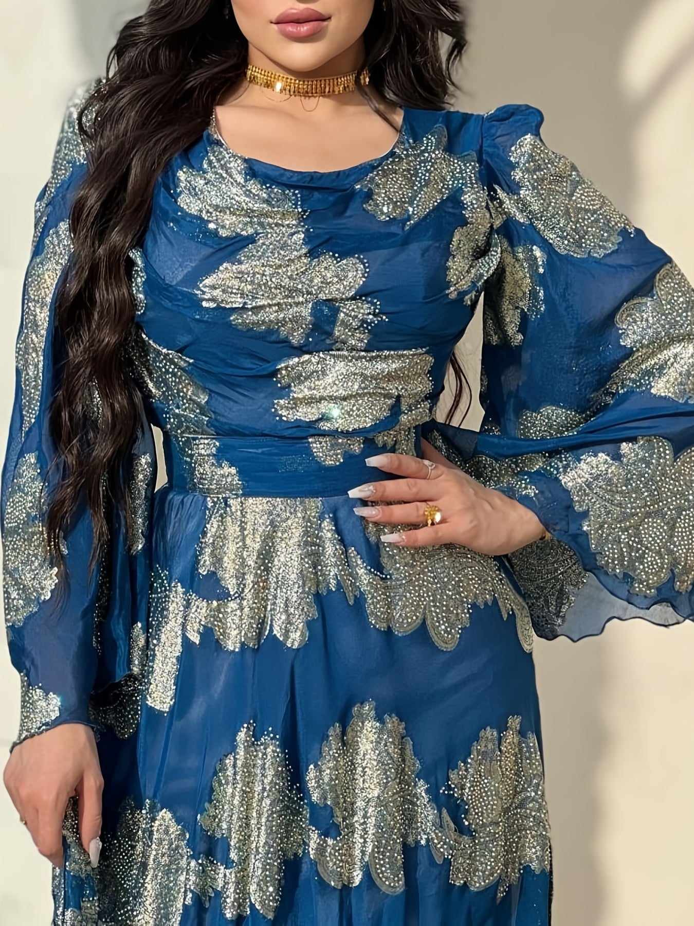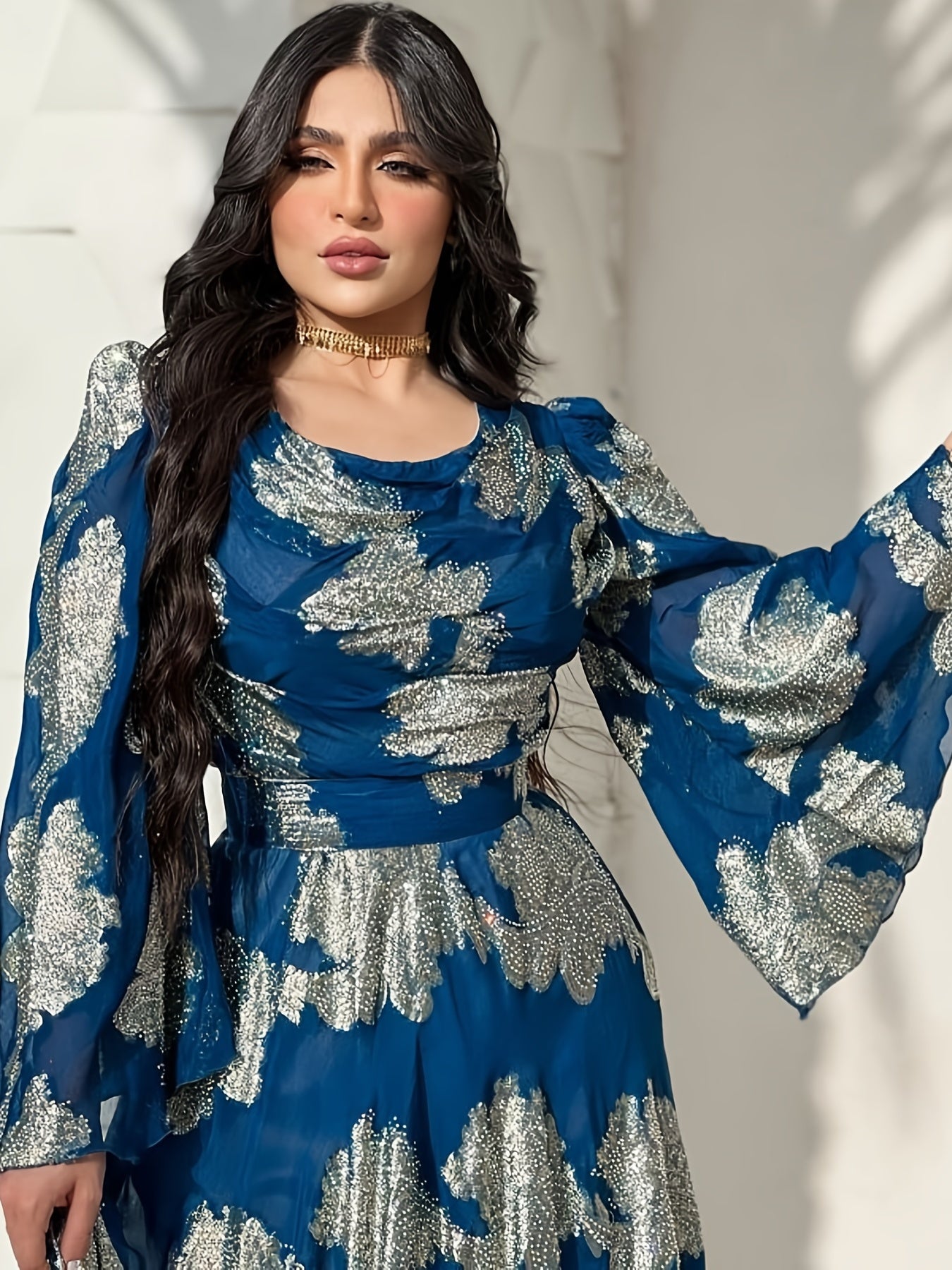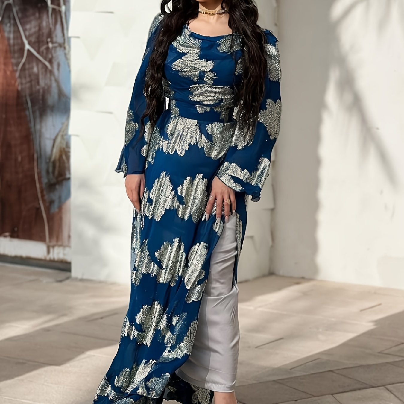 Sixsr Bronzing Crew Neck Dress, Elegant Long Sleeve Slim Waist Split Party Dress, Women's Clothing