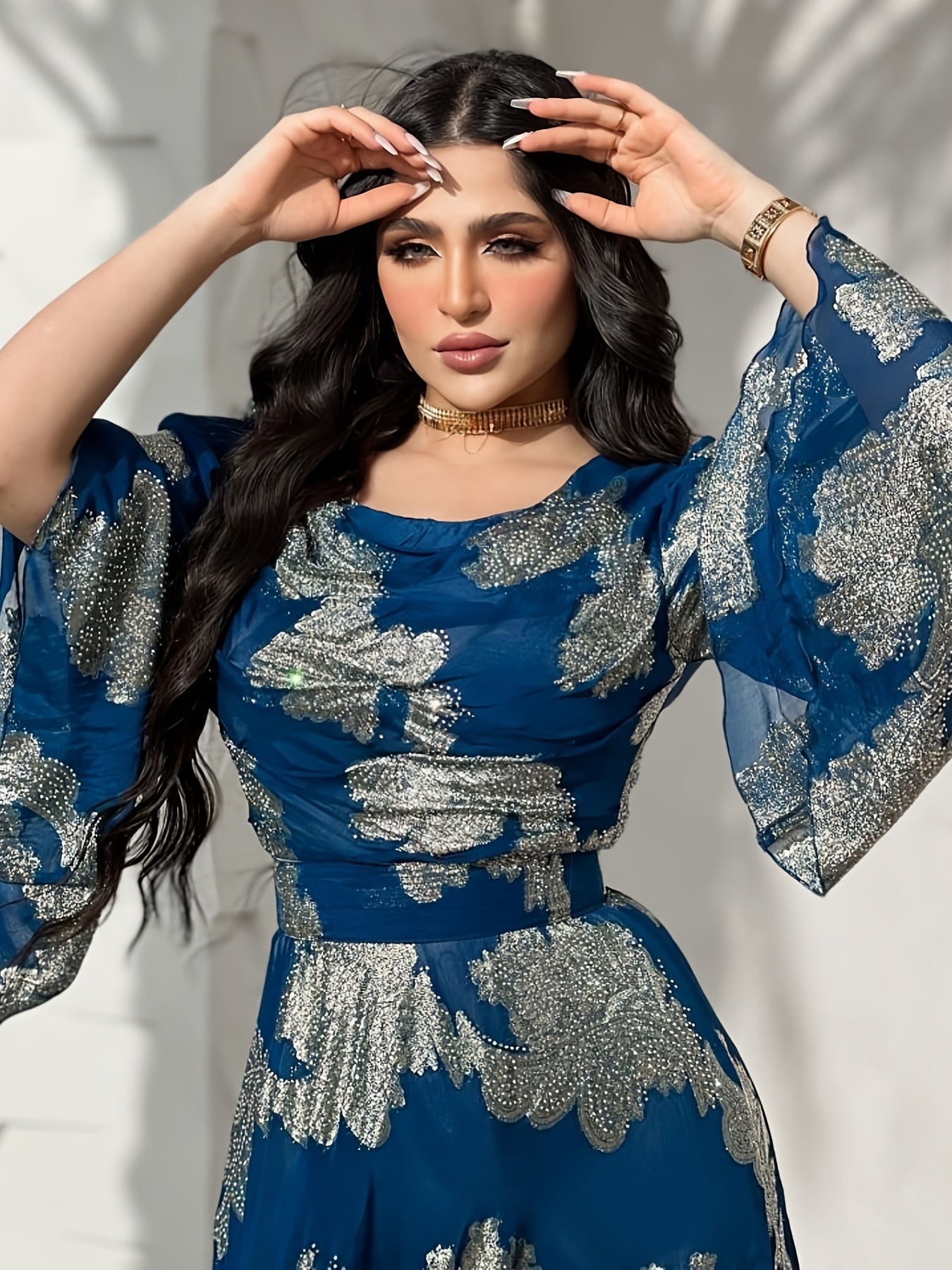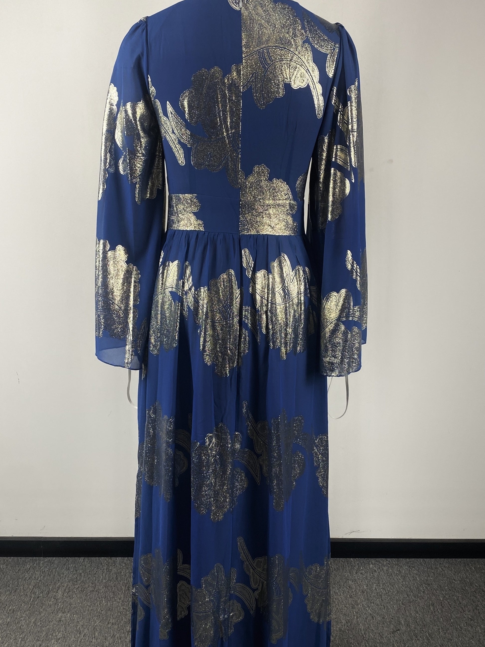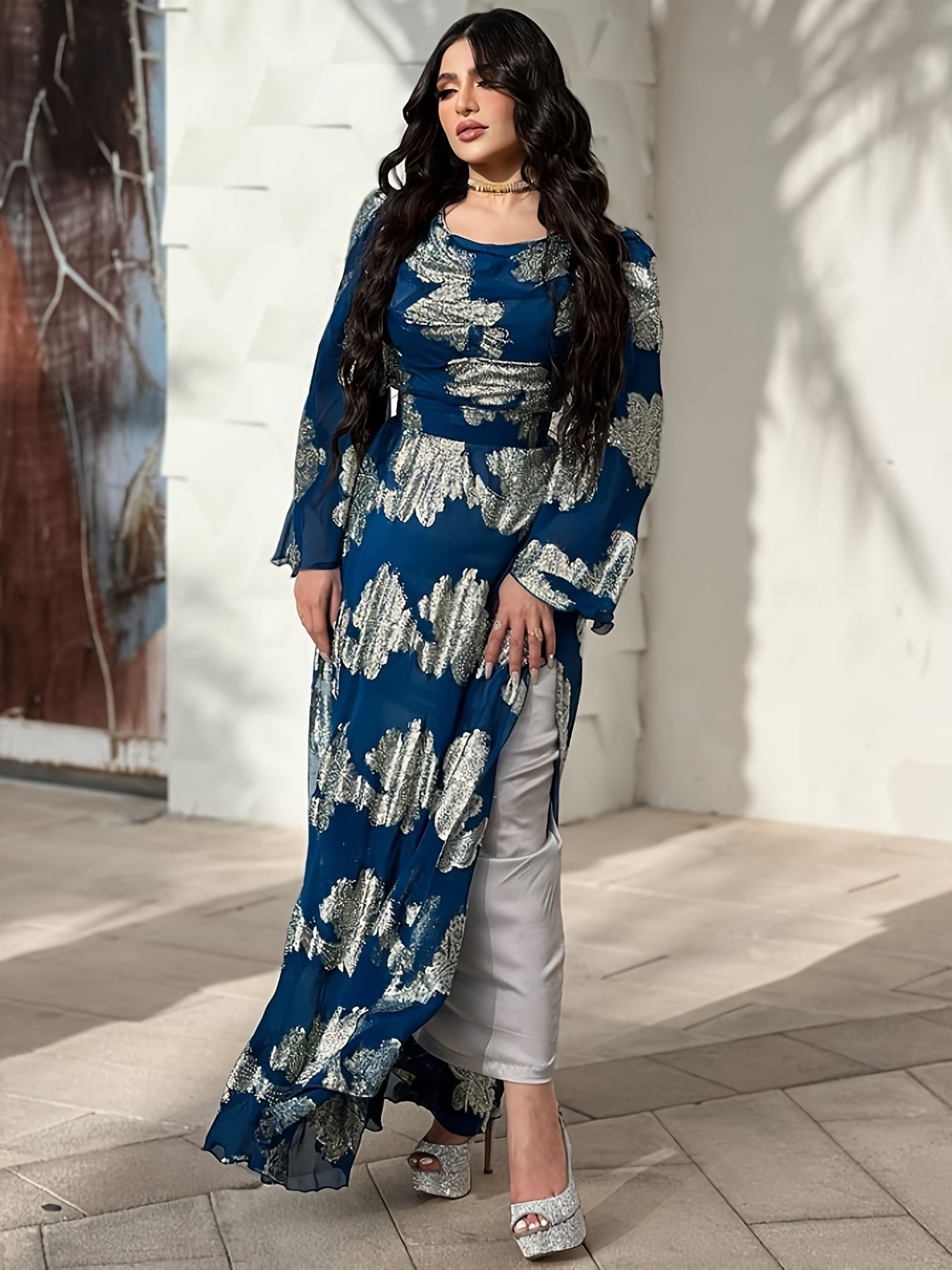 Sixsr Bronzing Crew Neck Dress, Elegant Long Sleeve Slim Waist Split Party Dress, Women's Clothing