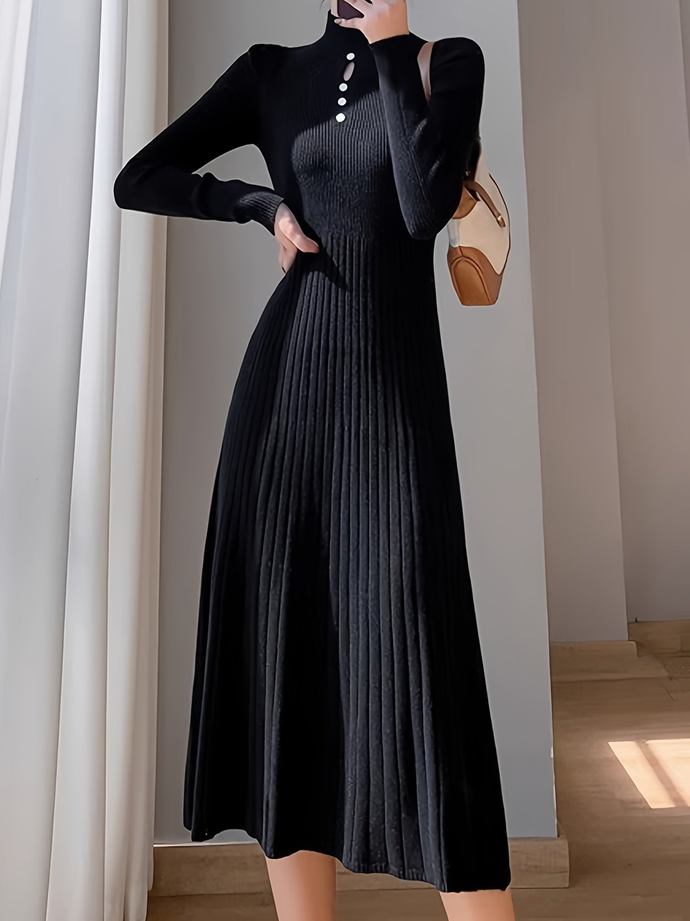 Sixsr Button Decor Keyhole Ribbed Dress, Elegant Long Sleeve Mock Neck A-line Knit Dress, Women's Clothing