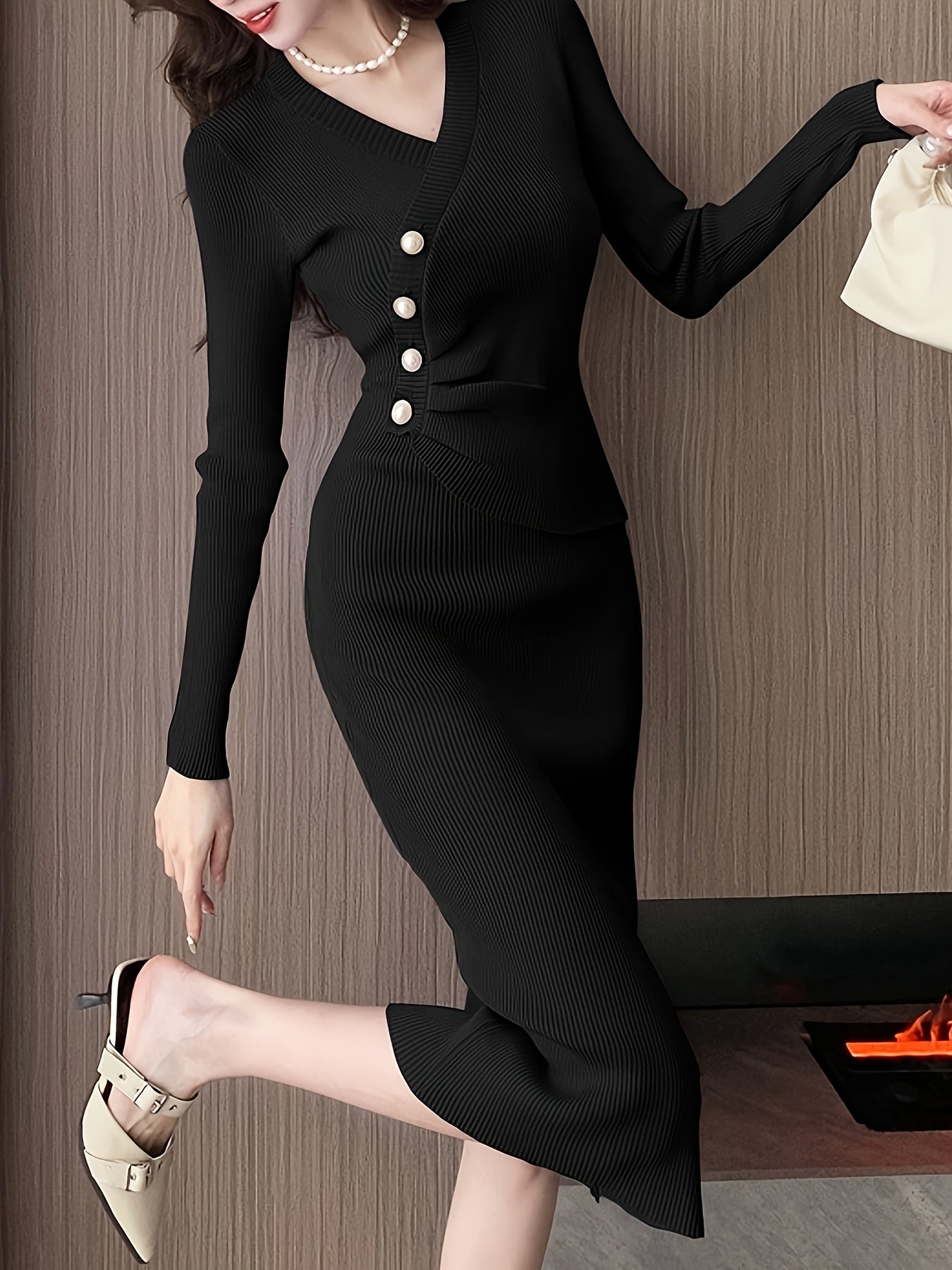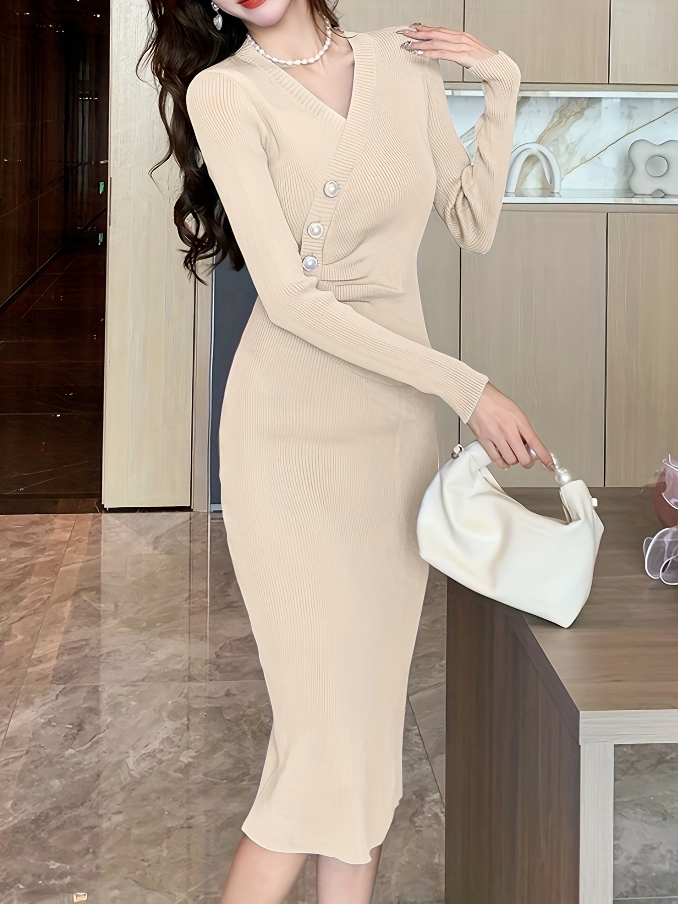 Sixsr Button Front Solid Midi Dress, Elegant V Neck Long Sleeve Dress, Women's Clothing