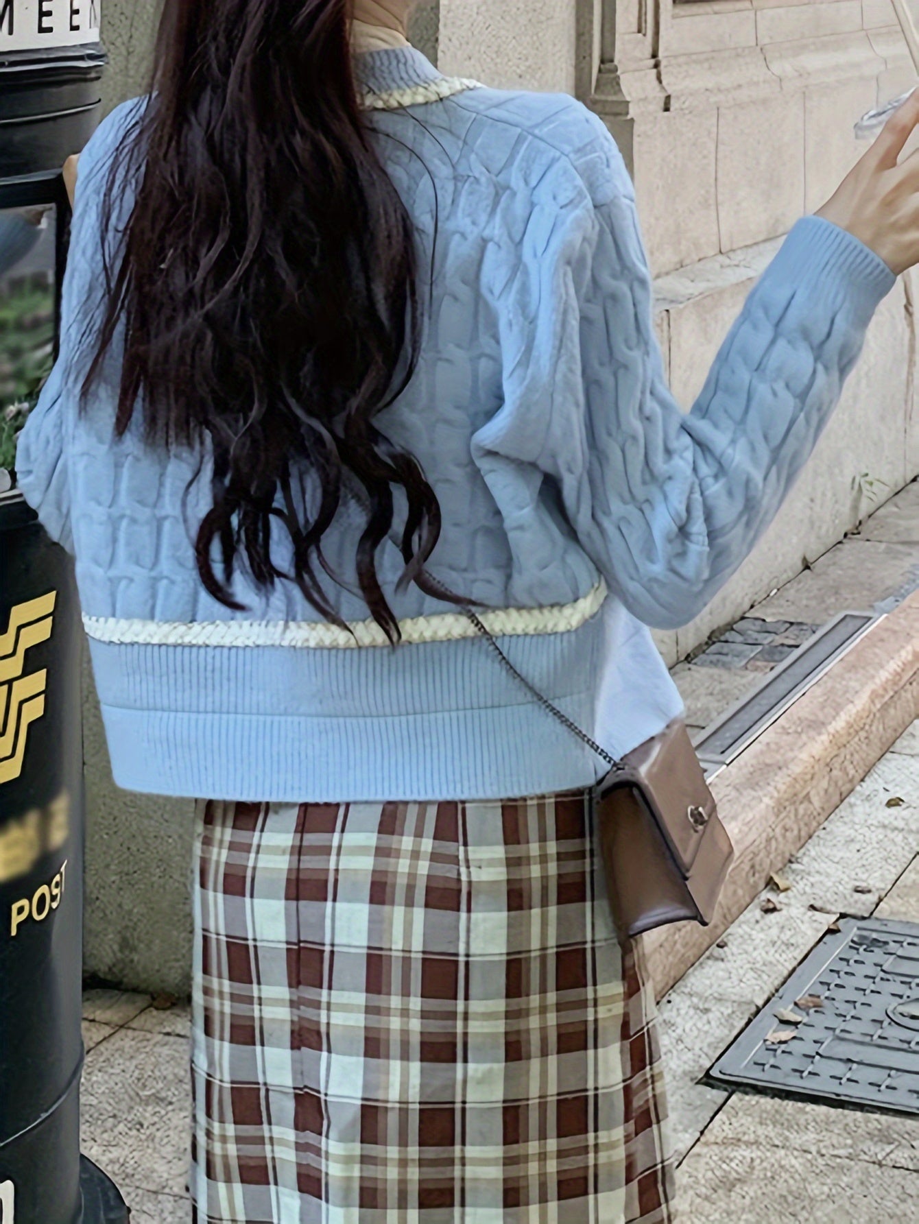 Sixsr Cable Knit Button Up Cardigan, Casual Crew Neck Long Sleeve Sweater, Women's Clothing