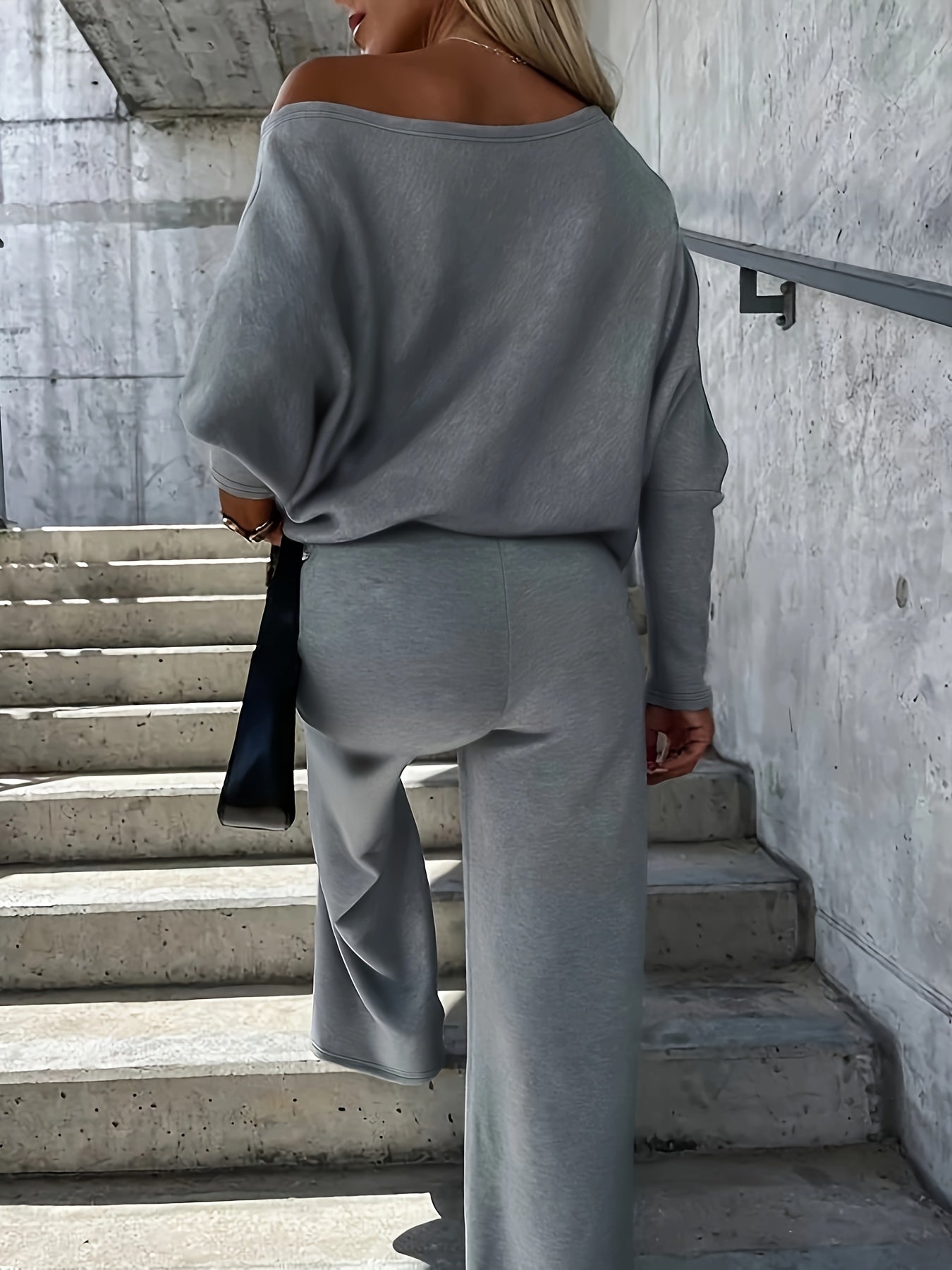 Sixsr Casual Solid Two-piece Set, One-shoulder Loose Top & Wide Leg Pants Outfits, Women's Clothing