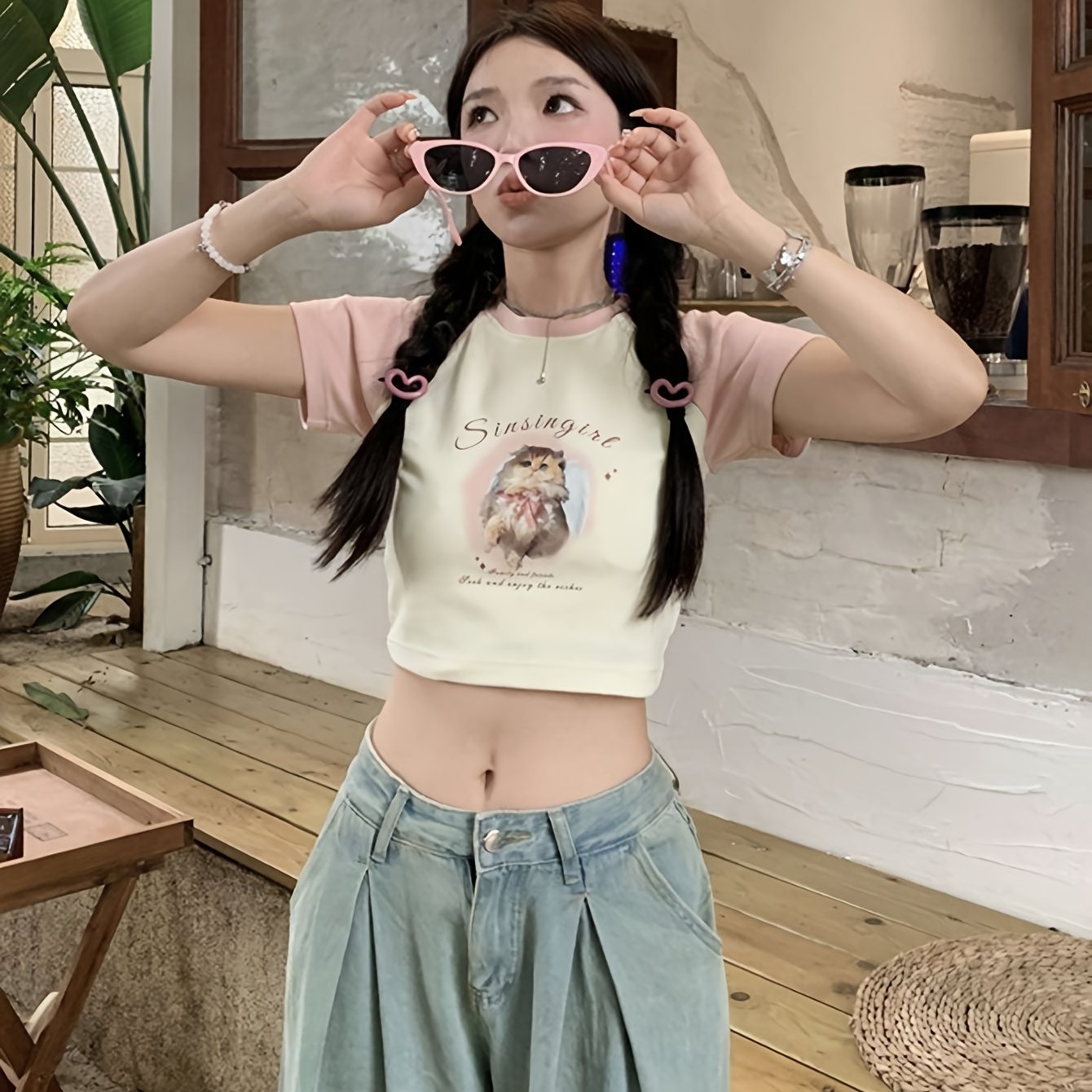 Sixsr Cat Print Crew Neck Crop T-Shirt, Y2K Short Sleeve T-Shirt For Spring & Summer, Women's Clothing