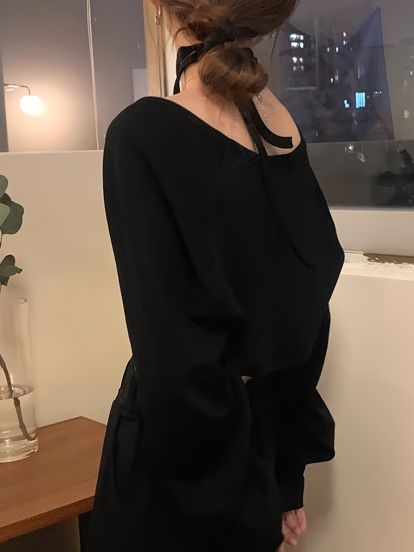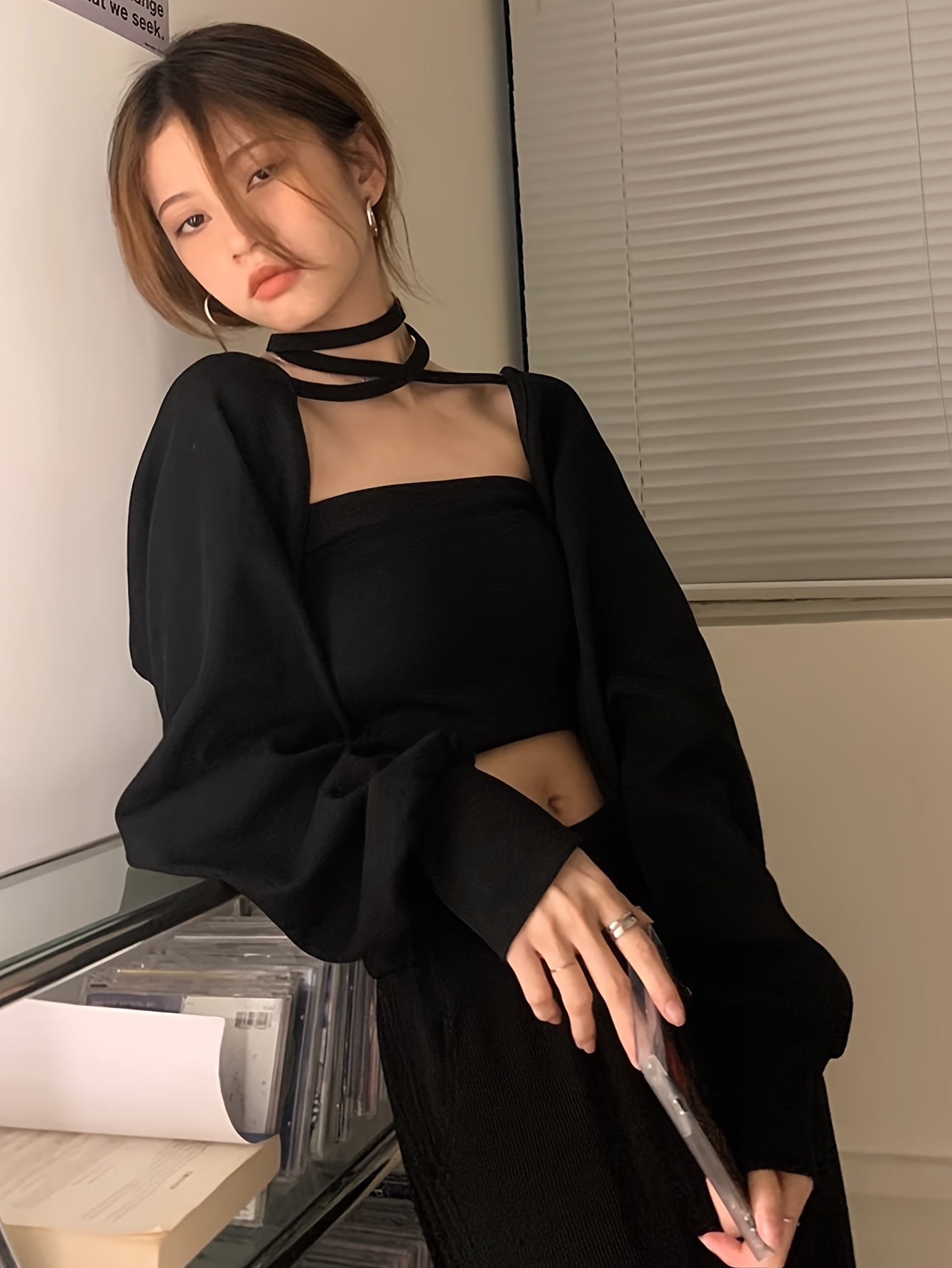 Sixsr Chic Solid Color Two-piece Set, Crop Strapless Tube Top & Choker Neck Long Sleeve Shrug Outfits, Women's Clothing