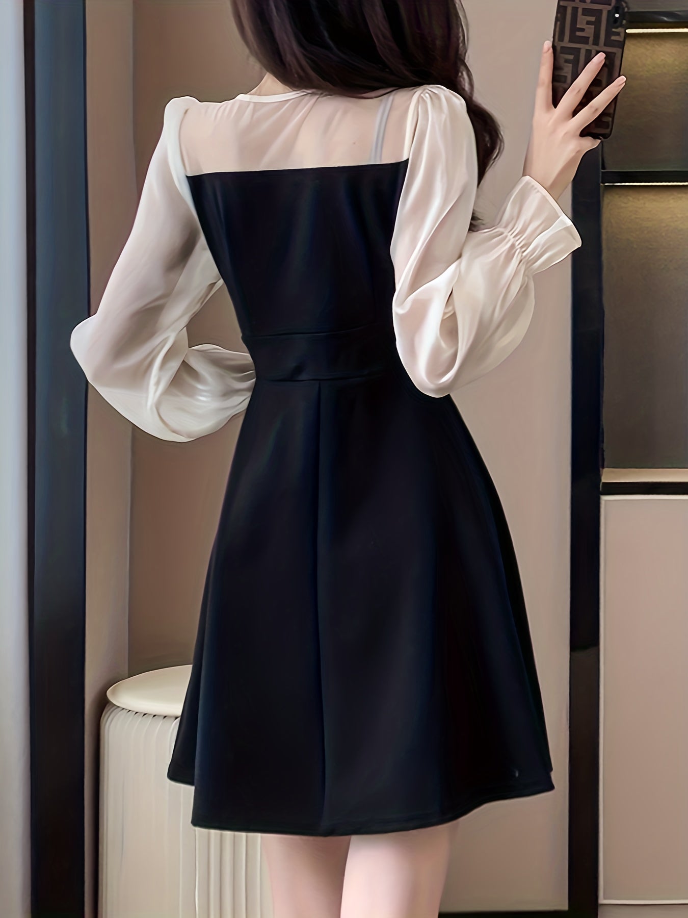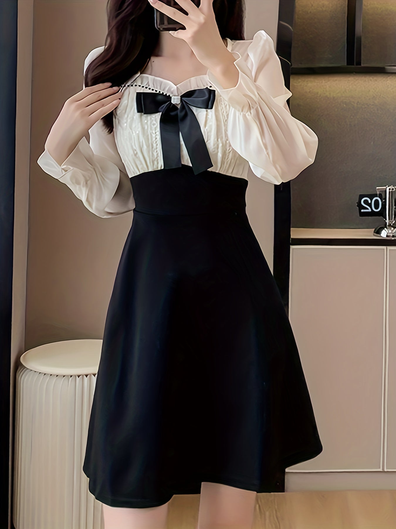 Sixsr Color Block Bow Tie Dress, Elegant Ruffle Trim Long Sleeve Dress, Women's Clothing